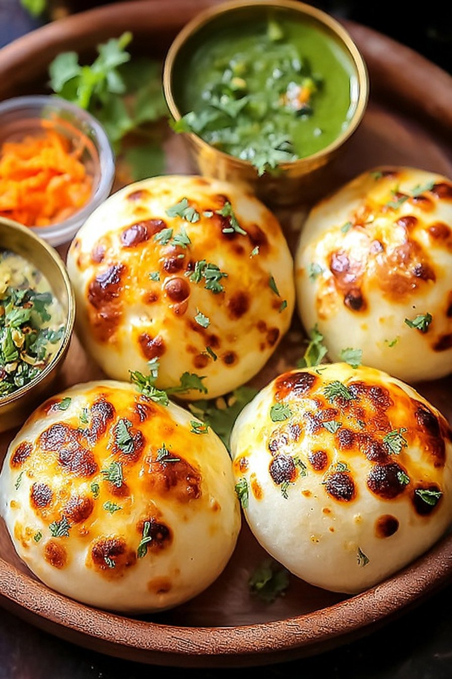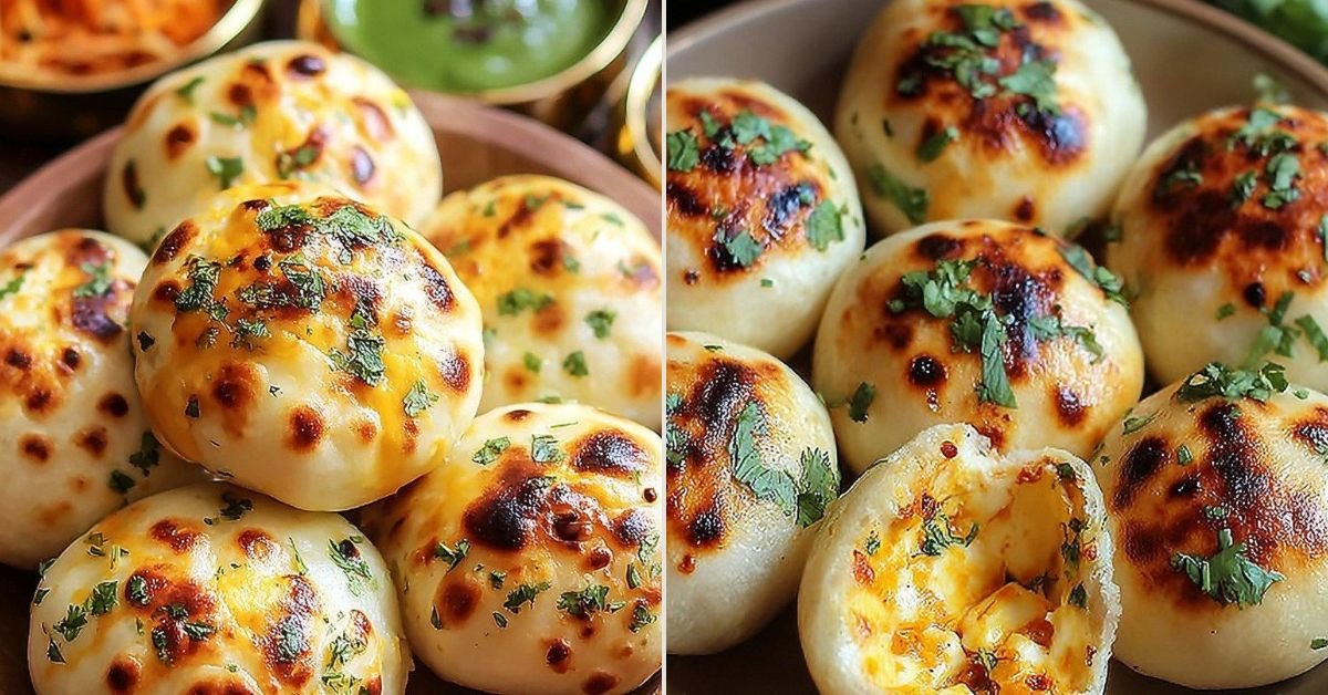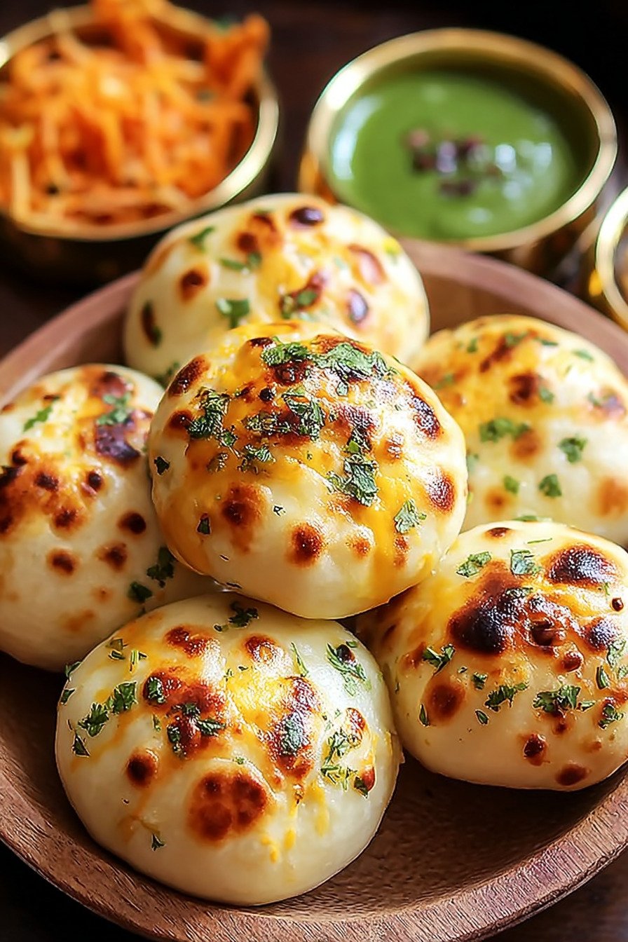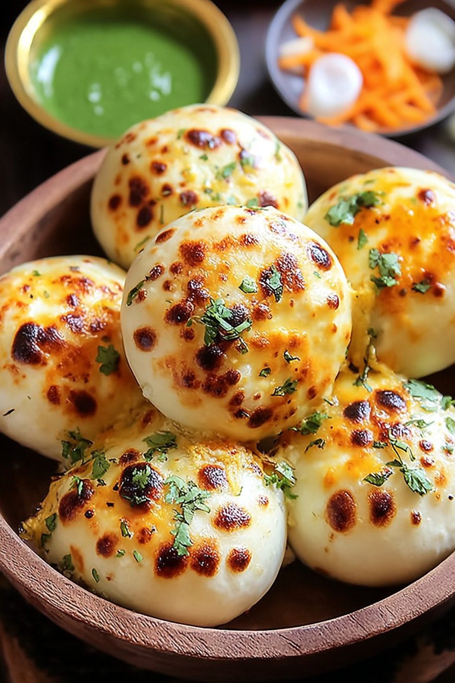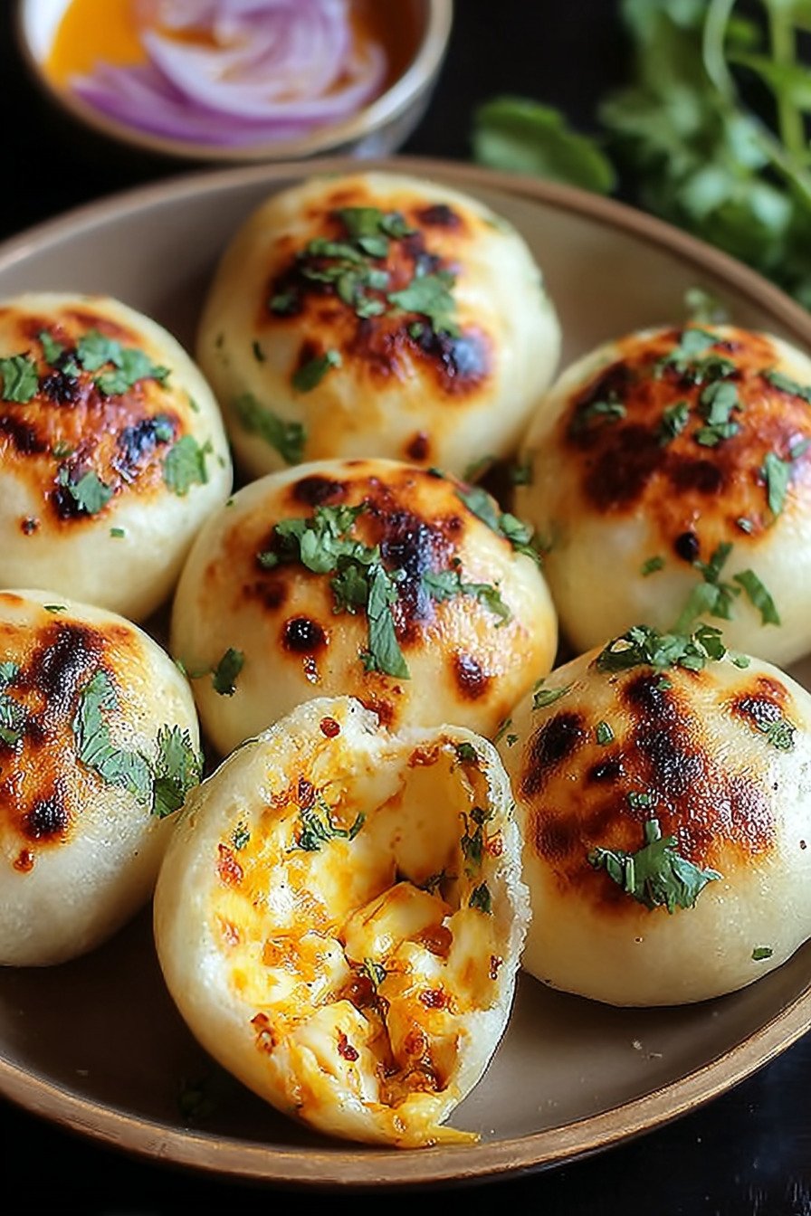 Small dough balls bake into soft puffs with a molten center. Paneer meets mozzarella. Pickle spice lifts each bite. The tray empties fast. Hands race. Smiles spread.