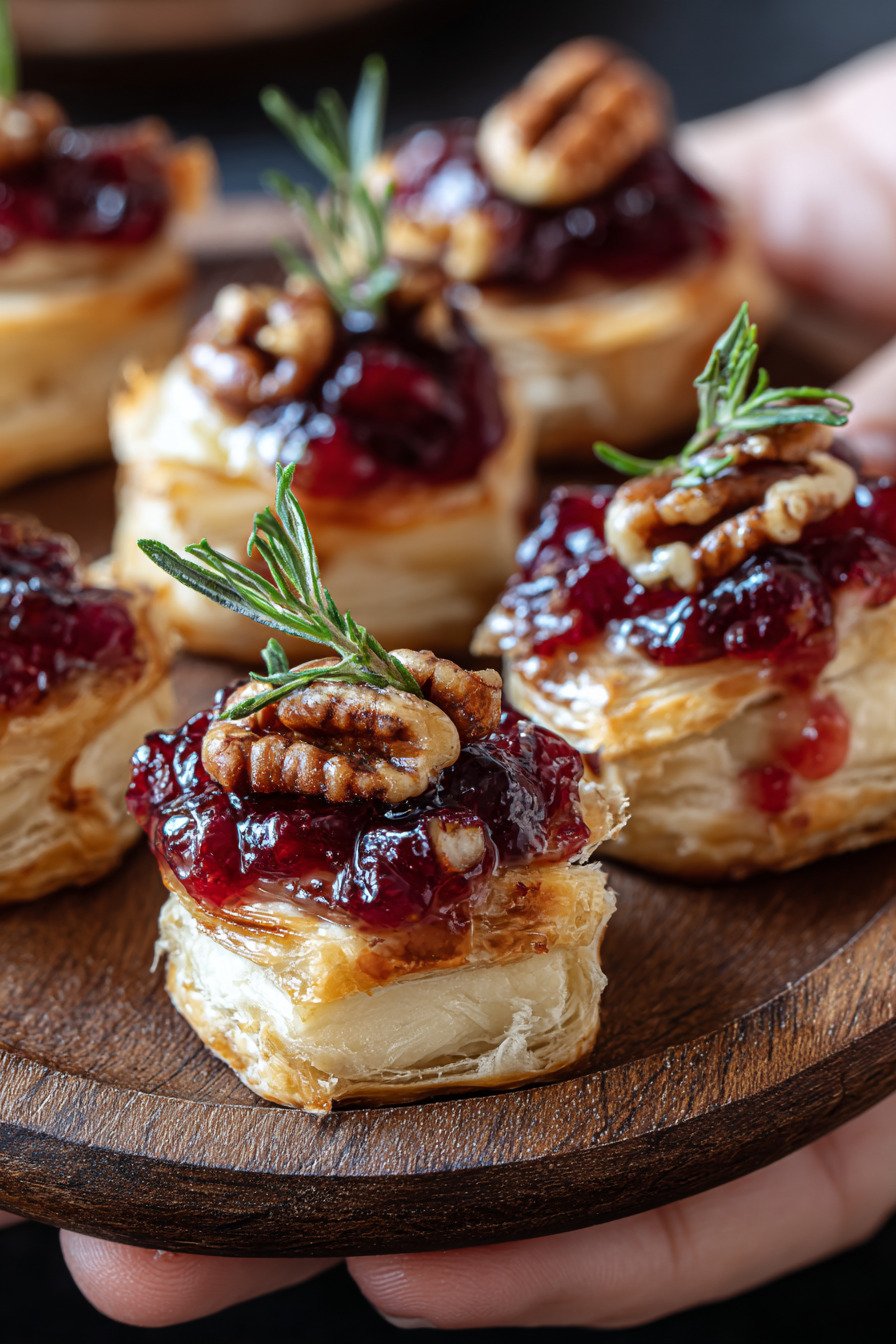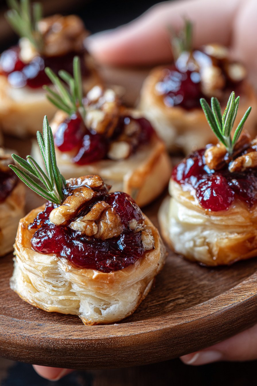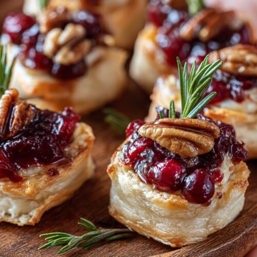 I make these little bites when friends drop by and the room warms up. Buttery pastry cradles soft brie. A bright cranberry spoonful lands on top. Each bite feels rich yet light. I reach for another without thinking. We bake the cups till the pastry turns golden and the cheese loosens. The berries taste tart and sweet. The rosemary gives a pine note that hints at winter walks. You can taste a soft crunch as the layers break. The plate empties fast and no one complains. I like how simple parts come together. We use ready pastry and a small wheel of brie. We cut clean squares and press them into a tin. We bake once and then again after the topping. You serve warm. You smile. It feels easy and kind.