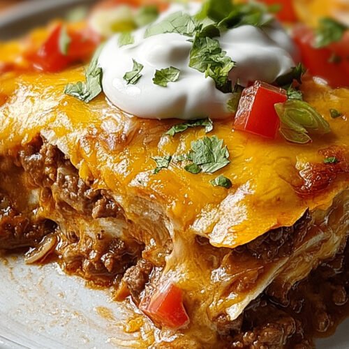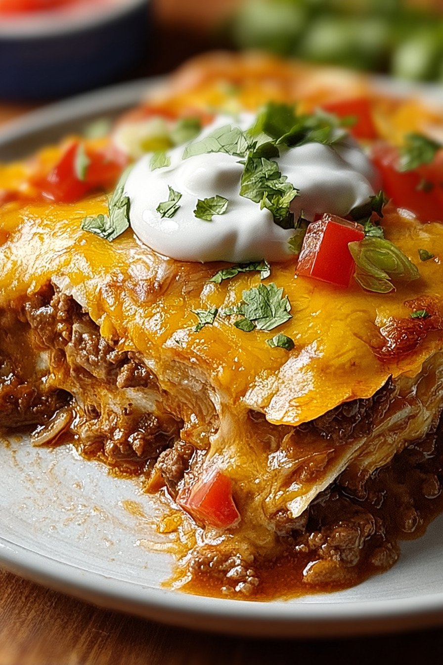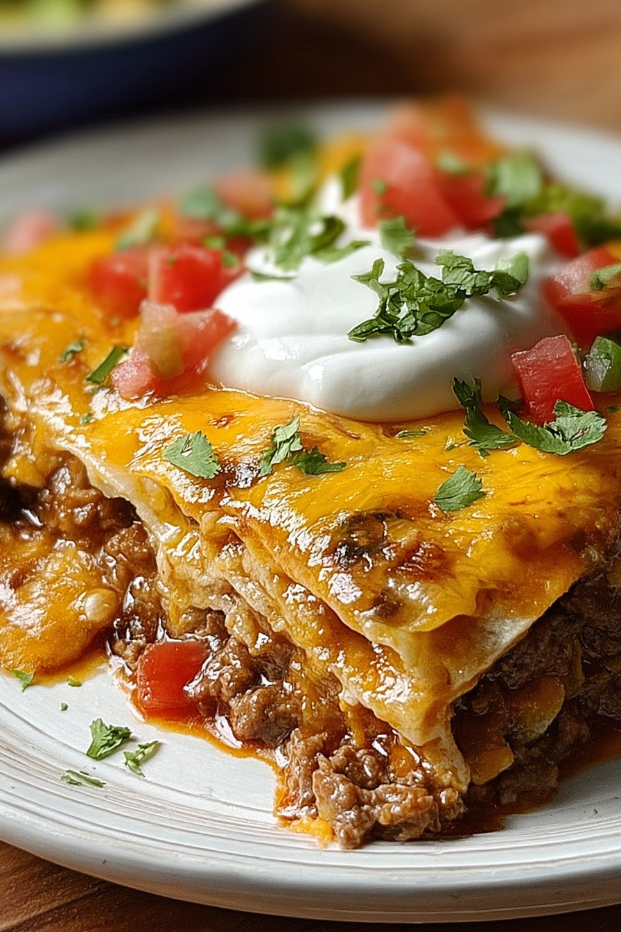 I layer warm tortillas the beef mix and plenty of cheese. The stack bakes until the top turns glossy and the edges bubble. The slice lifts clean and the cheese stretches in soft strings. It lands on a plate with a sprig of cilantro and a small wedge of lime.
