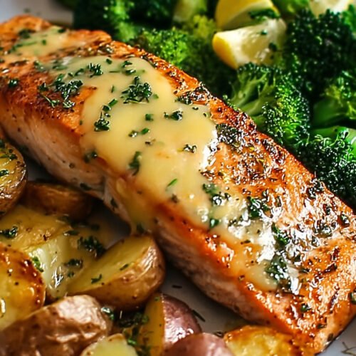 Salmon baked with lemon butter is one of those dishes that feels both simple and special. When I think about baked salmon recipes, I picture a tray sliding out of the oven with golden potatoes on one side, bright green broccoli on the other, and salmon fillets right in the middle, glistening with butter and citrus. This isn’t just food—it’s a little piece of comfort with a touch of elegance. I’ve made this recipe more times than I can count, and every single time it reminds me of why I love salmon recipes. The fish stays tender, the broccoli takes on just enough of that roasted flavor, and the potatoes? They turn into these irresistible little bites that are crispy outside and soft inside. It’s a recipe for baked salmon that doesn’t ask for much from you, yet it delivers in a way that feels like you planned the whole day around dinner. If you’ve ever wondered how recipes baked in one pan manage to taste this good, the answer is balance. The lemon cuts through the richness of the butter, the salmon plays so well with both the greens and the carbs, and the whole thing feels like more than the sum of its parts. Whether you’re cooking from fresh fillets or trying out frozen salmon recipes baked straight from the freezer, this dish has your back.