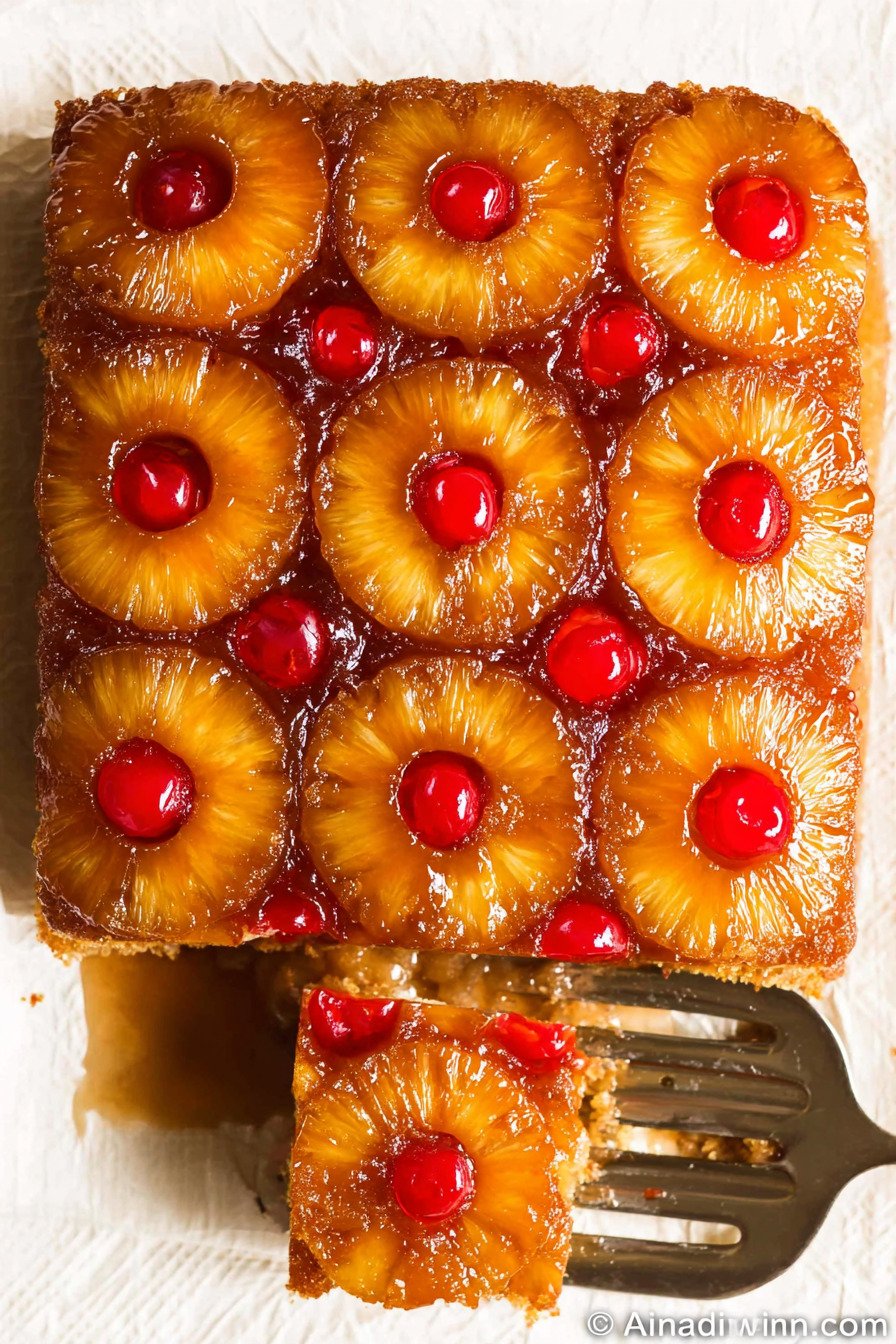 - This pineapple upside down cake recipe is buttery, moist, and topped with a gorgeous layer of caramelized pineapple and cherries.