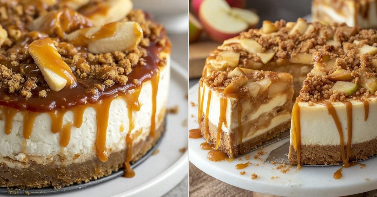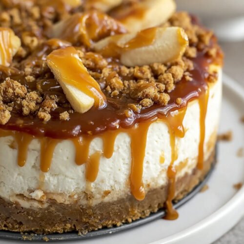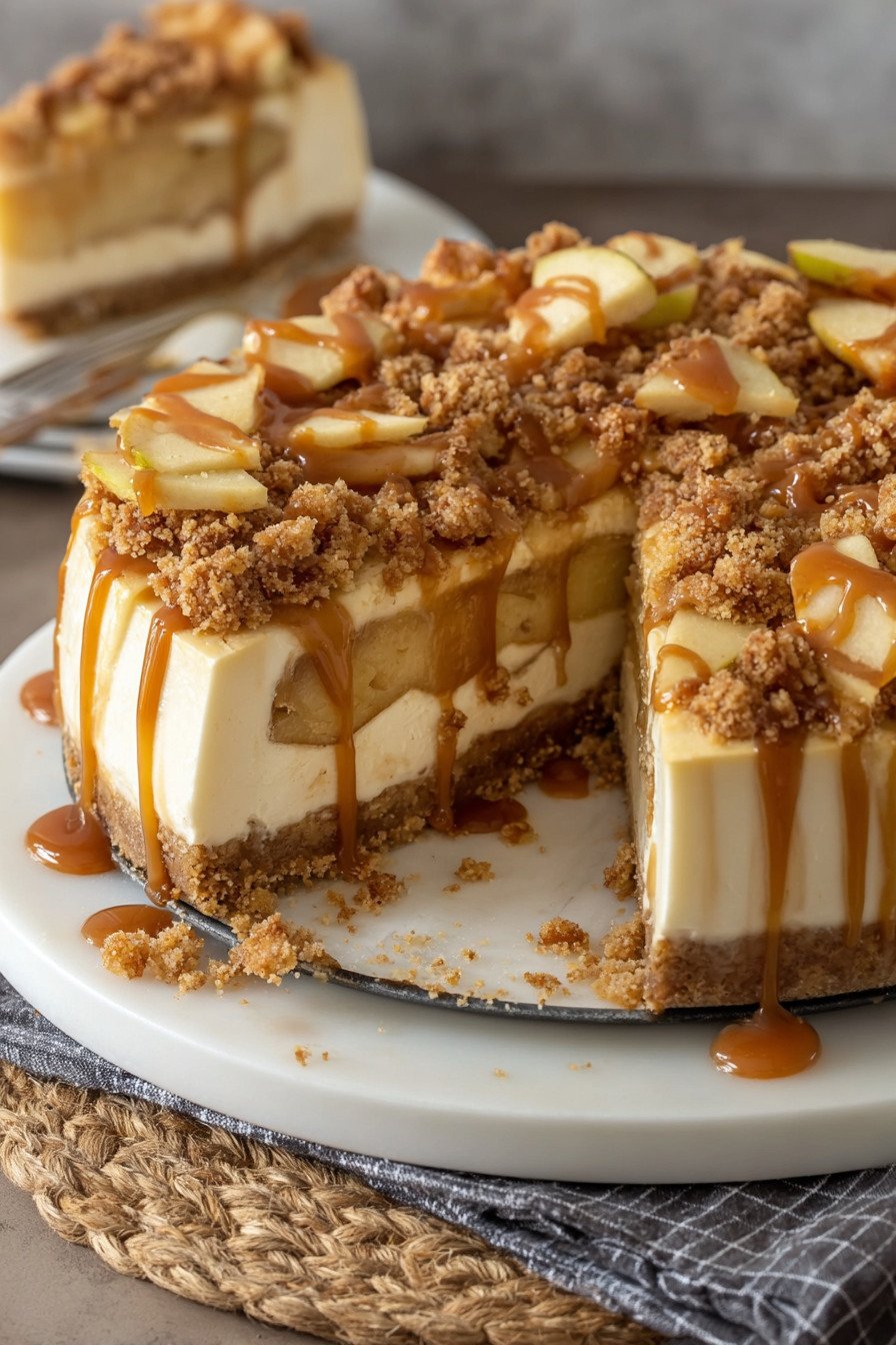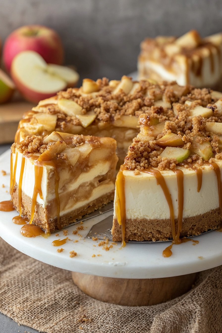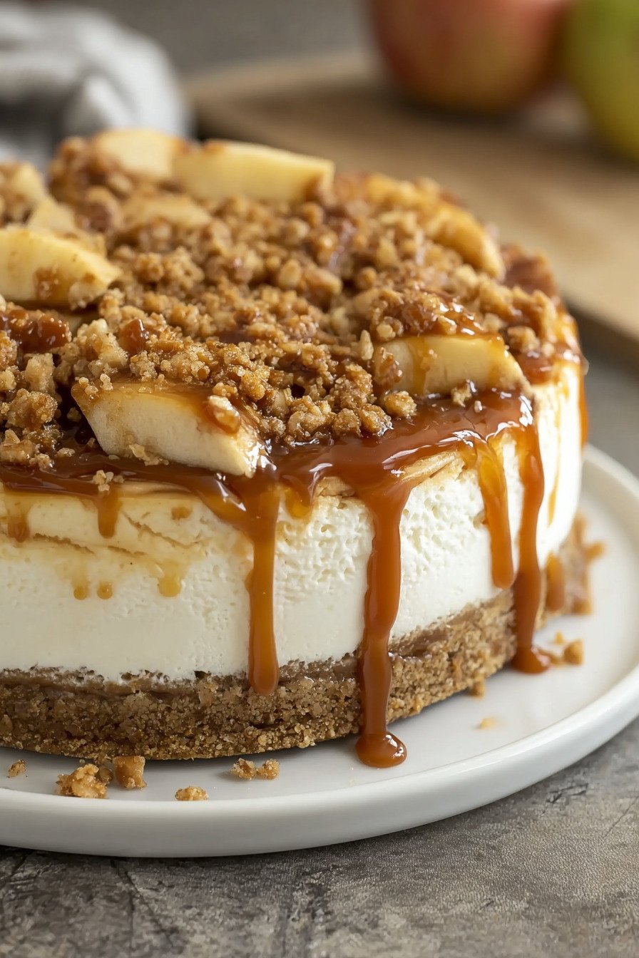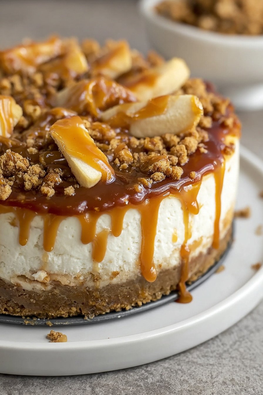 The base stays soft the center feels creamy and the apples sit bright on top. Caramel adds shine and a light salty snap.