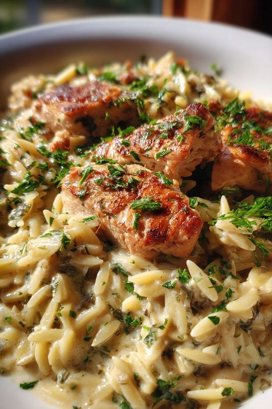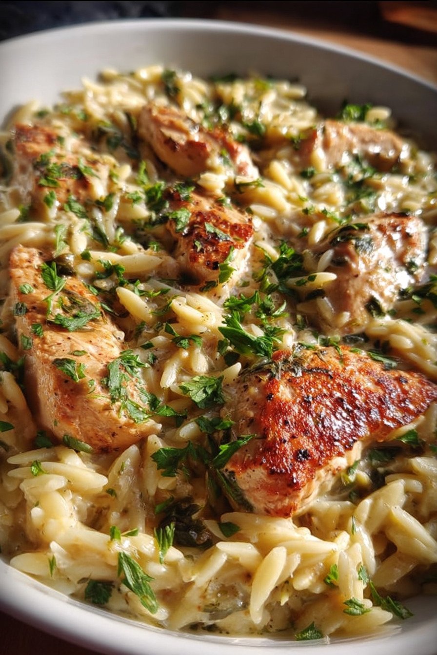 The chicken sears in a hot pan and forms a golden crust. I flip it once and let it finish cooking without fuss. Then I stir in the orzo and watch it toast just a bit. The broth goes in next, and the pasta swells as it cooks. The scent fills the kitchen and people drift in to check on me.