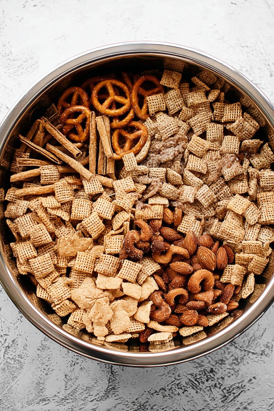 The process reads straight. Melt butter. Stir in sugar, cinnamon, and salt. Add vanilla at the end so it stays fragrant. Pour the warm syrup over the cereal, nuts, and pretzels. Toss until the shine reaches every corner. Bake until the mix dries and turns crisp. The room smells like toast from a happy childhood morning. You might think a candle could copy it. It cannot.