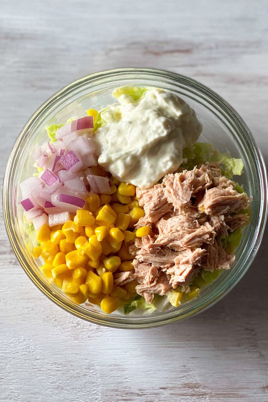 Step one Mix the filling Flake tuna in a bowl then add yogurt mustard lemon juice onion corn relish garlic powder and pepper. Stir till creamy and even. The mix should hold a soft mound and smell bright.