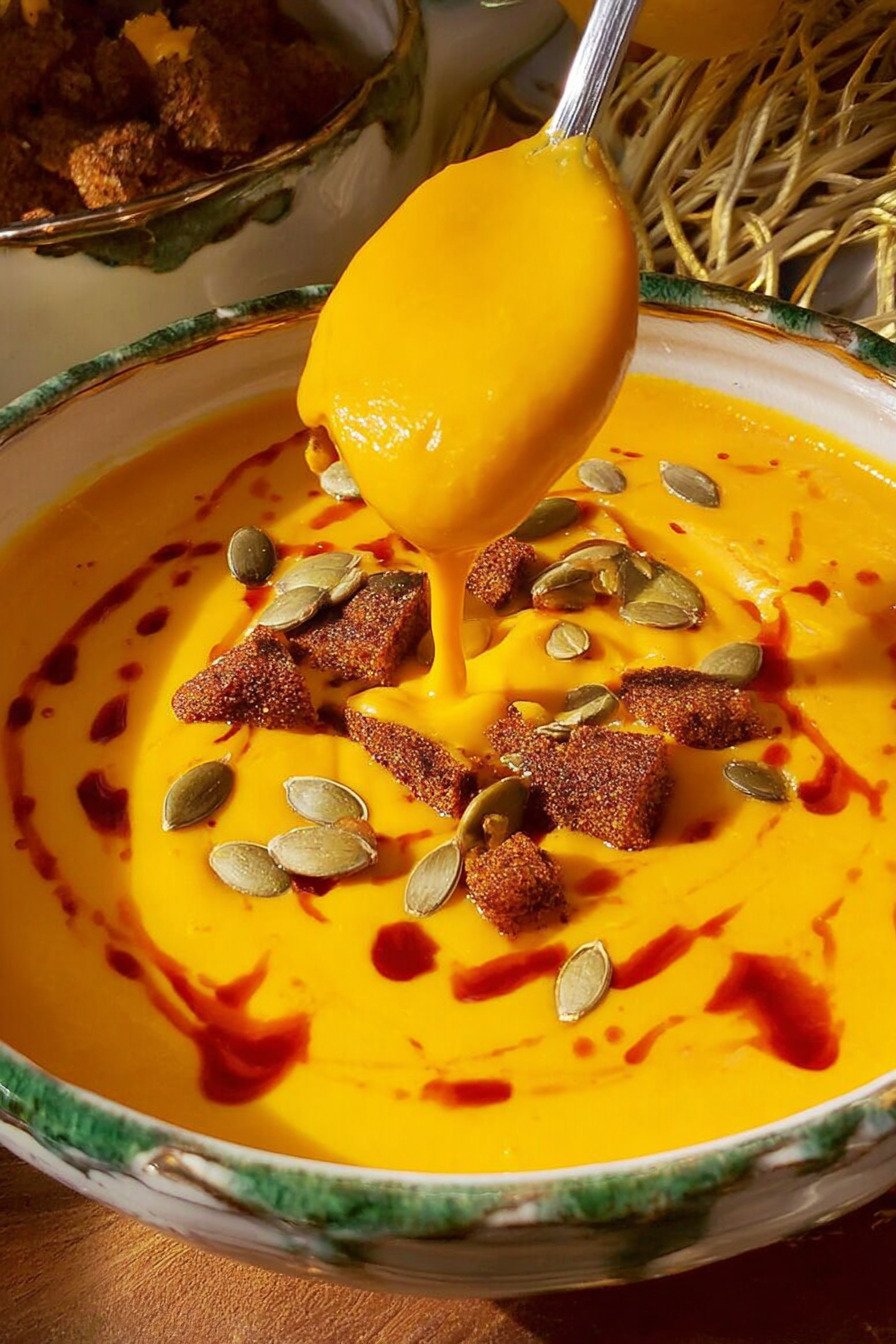 - Top each bowl with a swirl of cream roasted pumpkin seeds and fresh herbs.