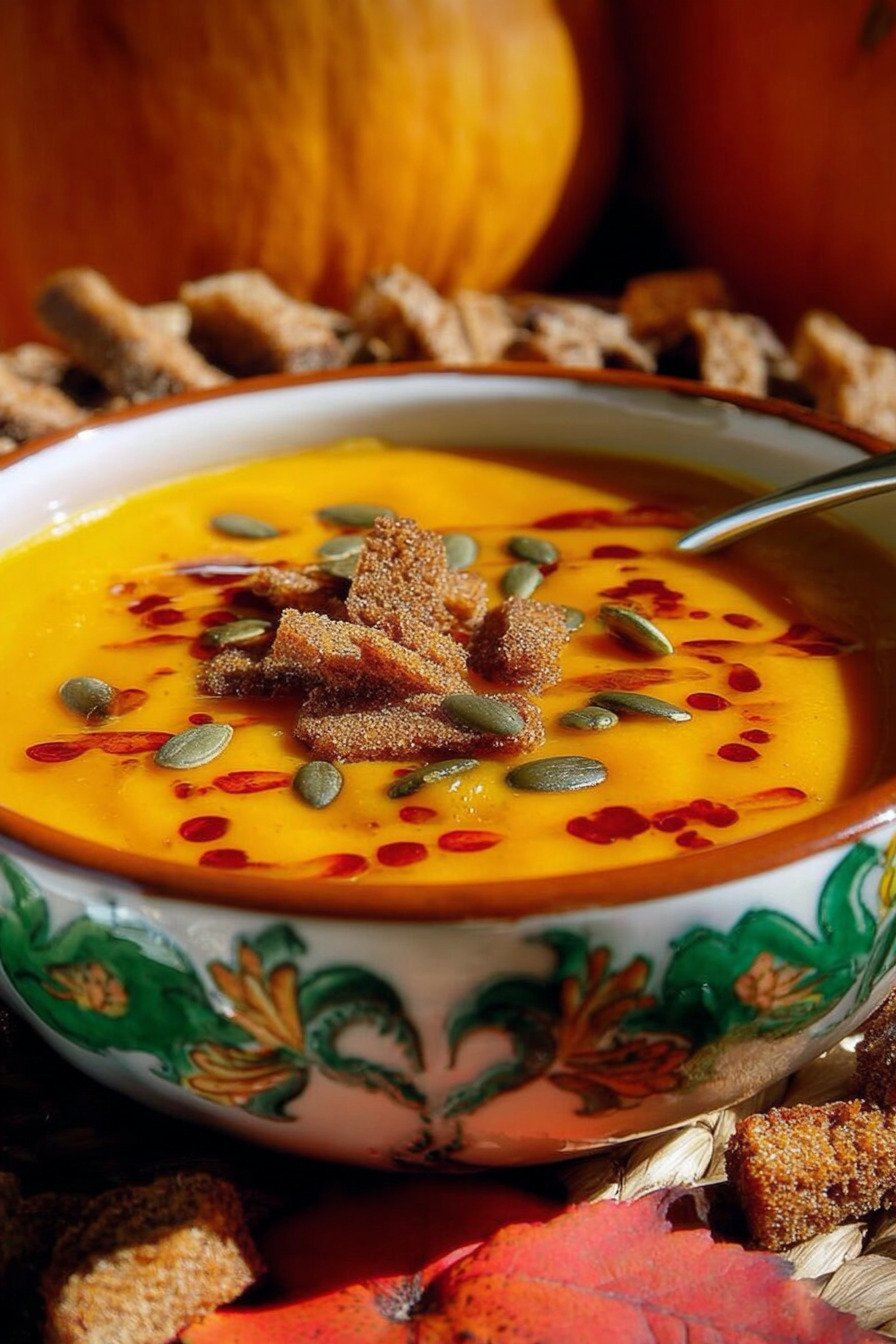 When the air turns crisp and the days feel shorter, I start craving a big bowl of soup that feels like a hug from the inside. This roasted pumpkin recipes soup is my cozy answer for long chilly evenings at home, when socks are thick and plans are simple. We roast the pumpkin until the edges caramelize and the kitchen smells warm and nutty, then turn it into the smoothest, silkiest bowl you can imagine. I love that this roasted pumpkin soup recipe tastes rich and indulgent yet still fits into my idea of a healthy pumpkin soup recipe. It is one of those autumn soup recipes that you can dress up for guests or keep relaxed for a quick weeknight dinner, and it always feels right. The texture lands somewhere between a classic autumn squash soup recipe and a light puree, with gentle spice that warms your hands and your mood. We lean into savory pumpkin recipes here, with garlic, onion, and a touch of spice that keeps every spoonful interesting. If you enjoy pumpkin recipes savory rather than sweet, this one might become your new tradition. I like to finish each bowl with a swirl of cream, crunchy seeds, and a slice of crusty bread on the side, then sit down and enjoy the quiet for a moment.