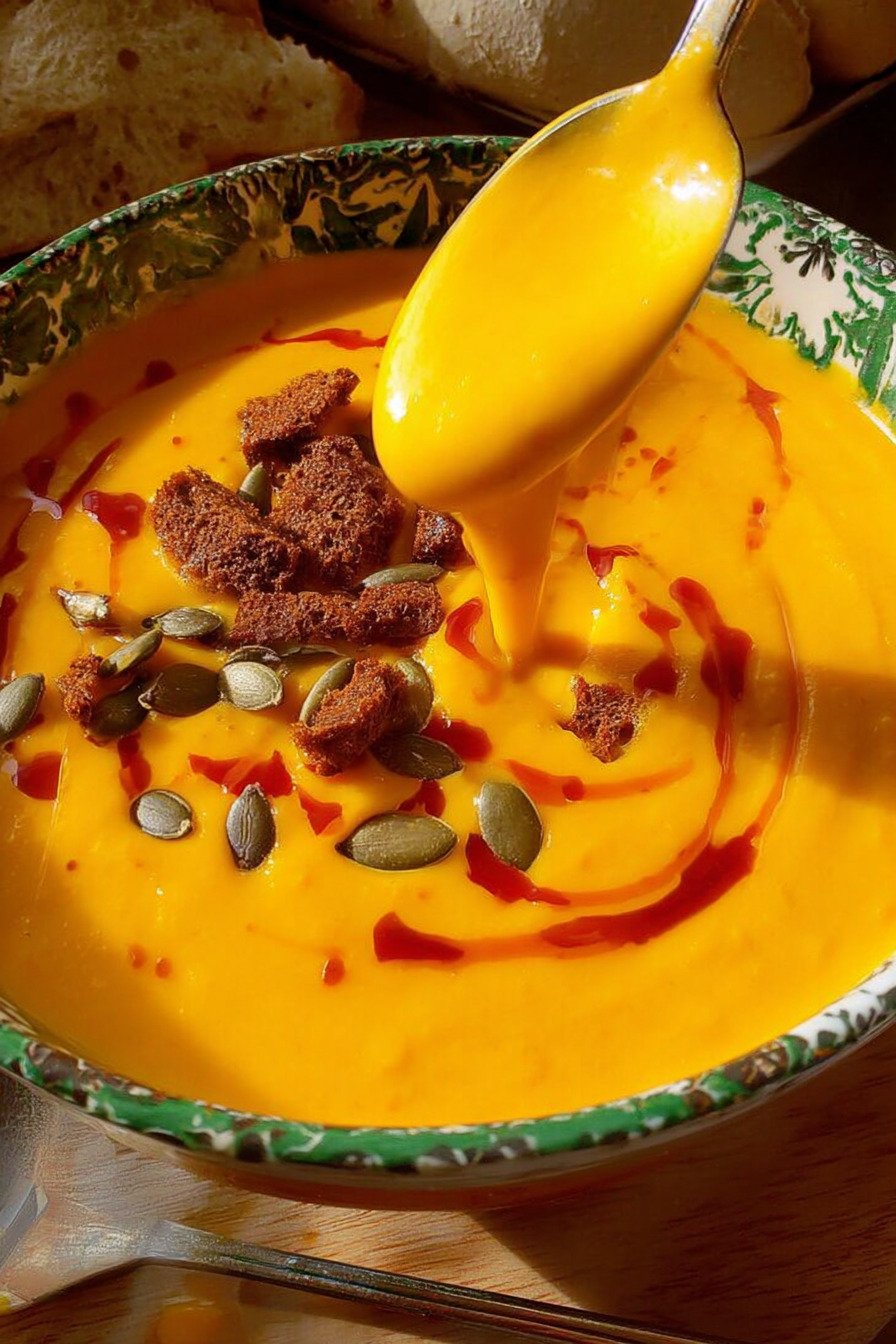 The soup starts with roasted pumpkin onion and carrot which gives a deep rich base without any heavy work. The spices lean toward cozy autumn soup recipes so the flavor feels familiar yet special enough for guests.