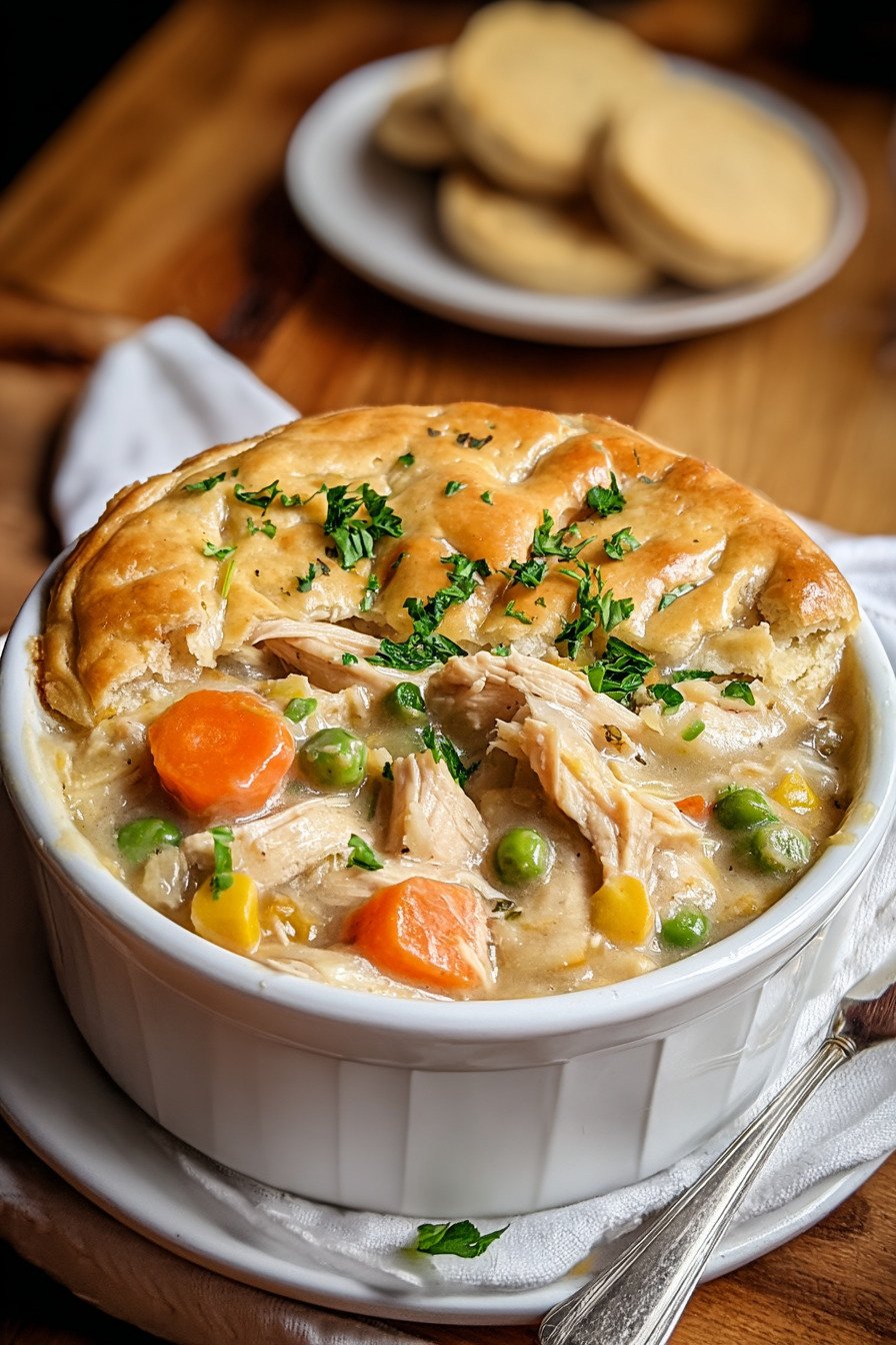 Ready biscuit rounds or puff pastry squares A fast top that bakes crisp and brings pot pie joy.