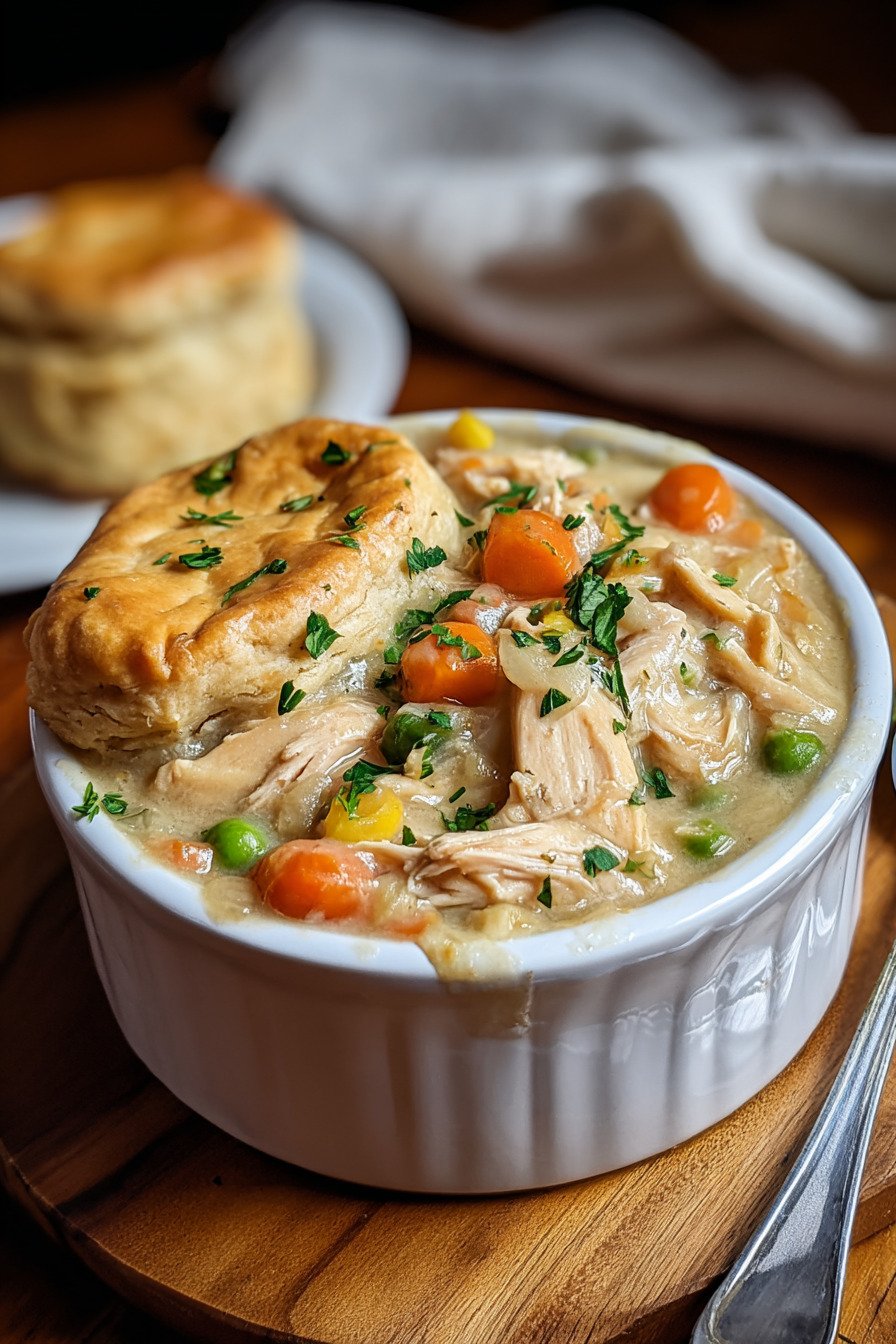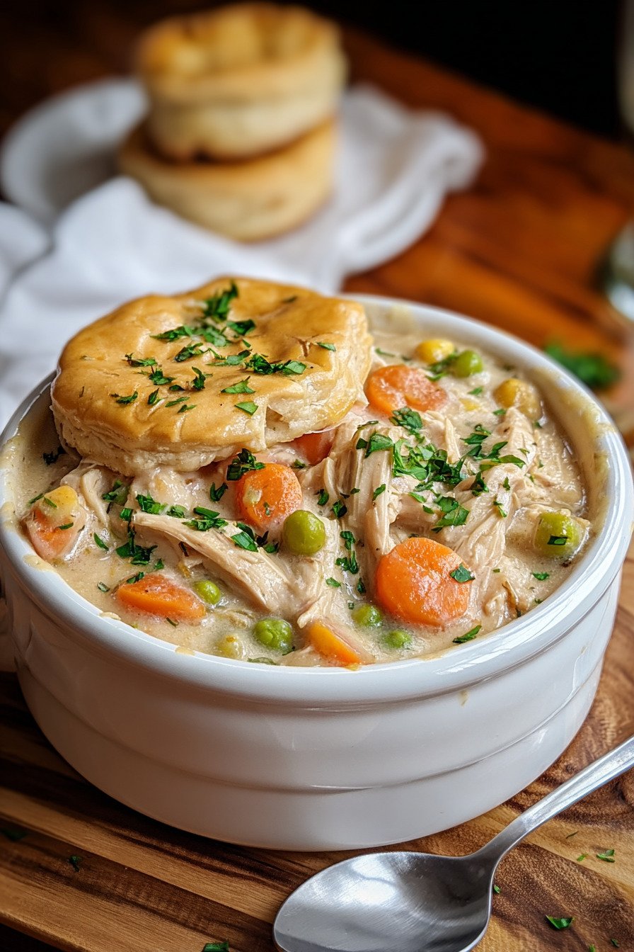 Keep the top simple. Ready biscuits or puff pastry both bake well. The finish snaps and the middle stays soft. This creamy crockpot chicken recipe keeps the work light.