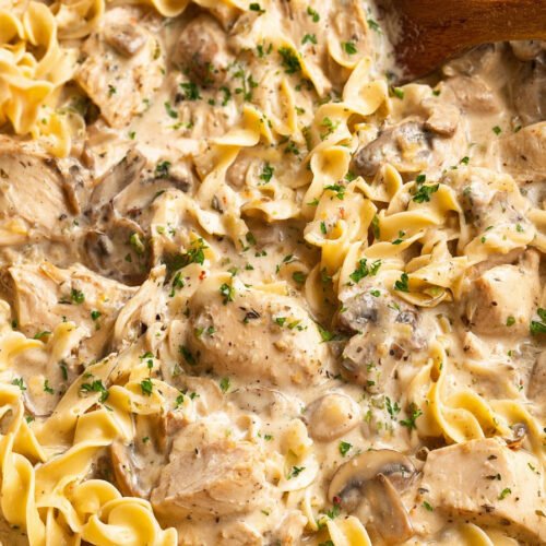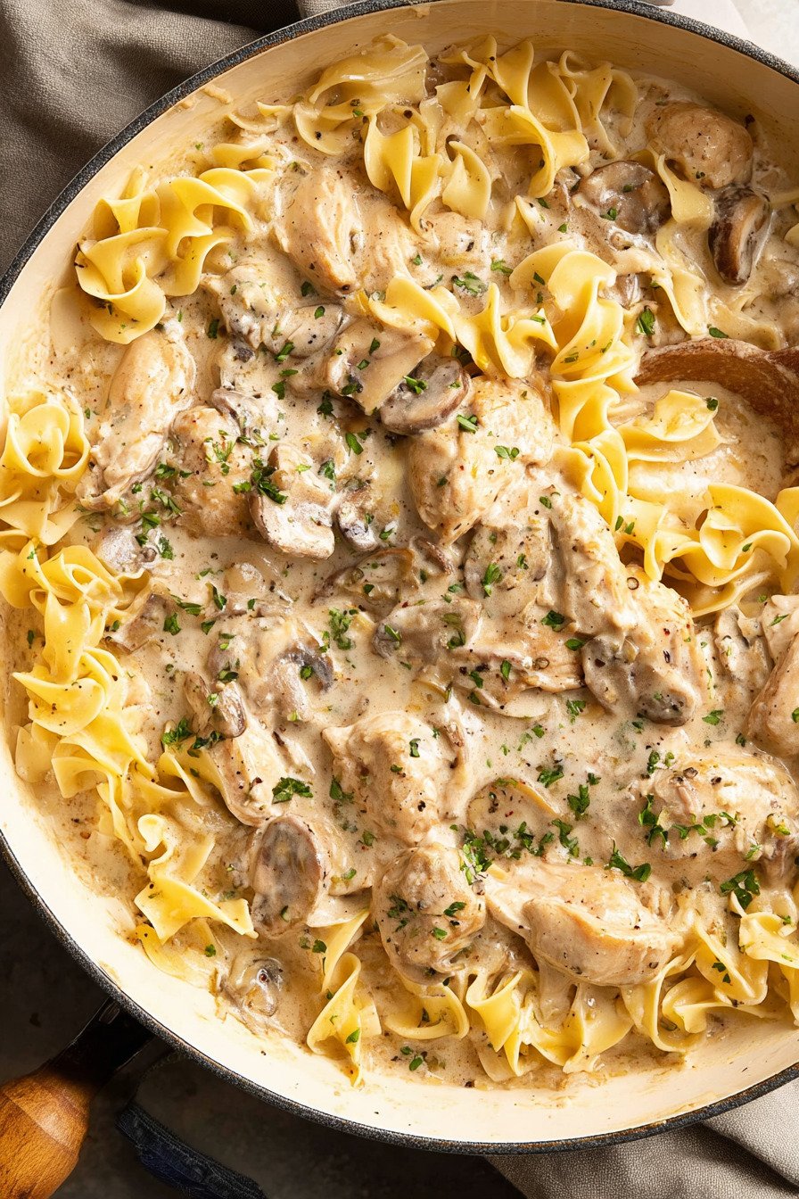 If you want to meal prep the full dish, cook the chicken and mushroom mixture ahead of time, then store it separately from the noodles. For the freshest texture, stir in the sour cream just before serving or reheat gently and add a little extra broth to loosen the sauce if needed.