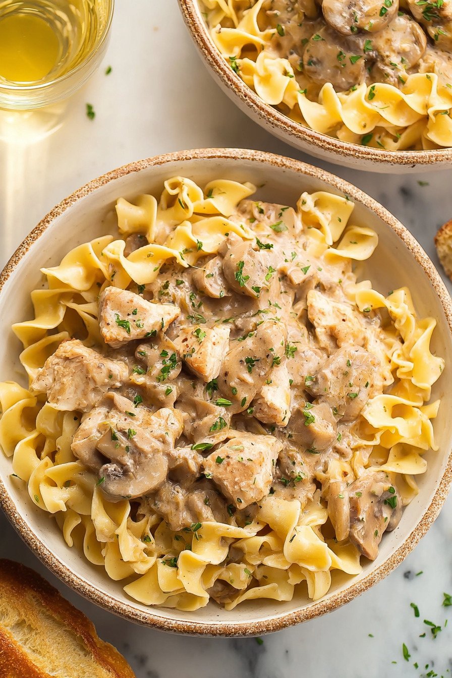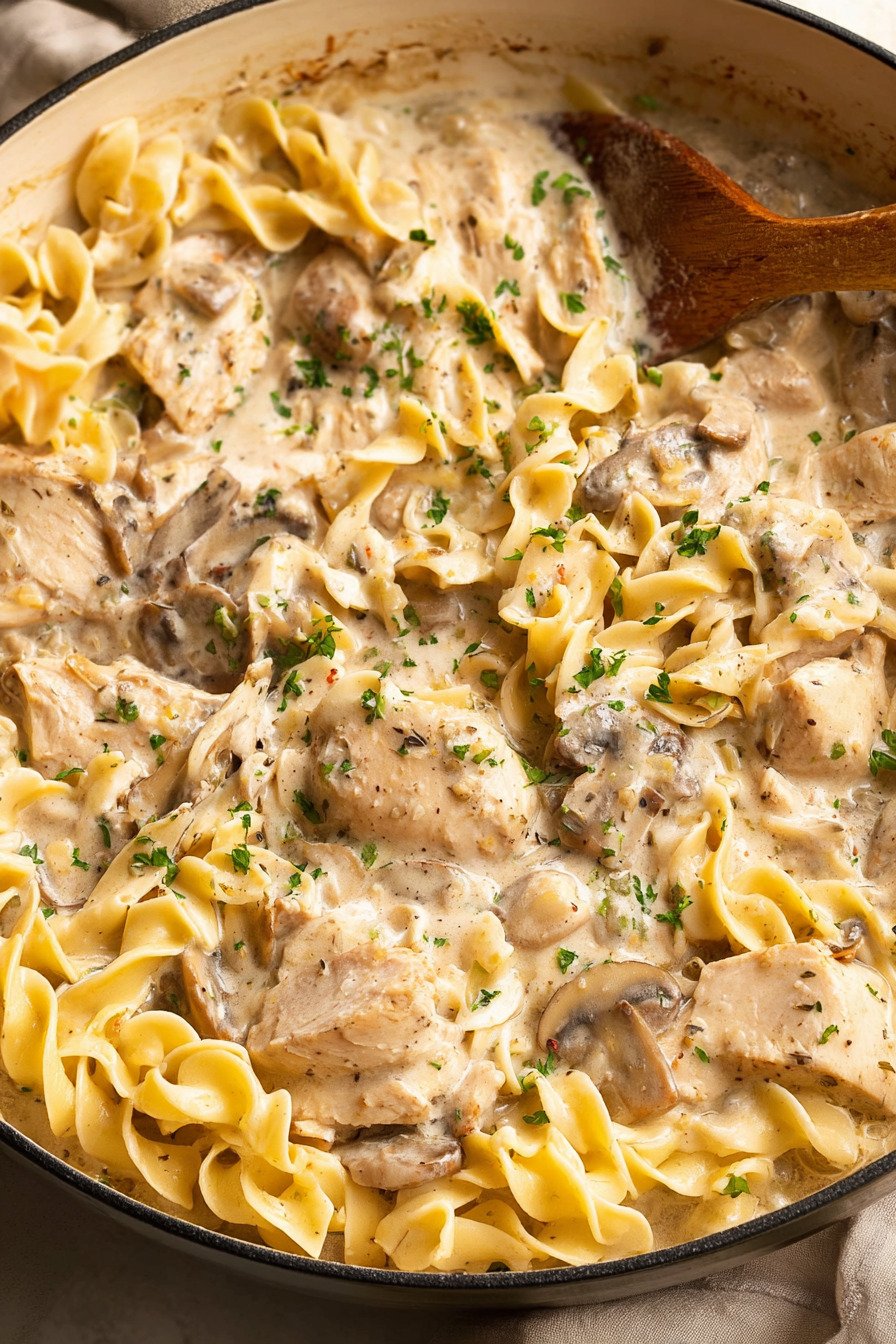 Step 6 Serve the finished chicken stroganoff over warm egg noodles and top with parsley. The result is a cozy, creamy dinner that feels classic, satisfying, and weeknight-friendly.