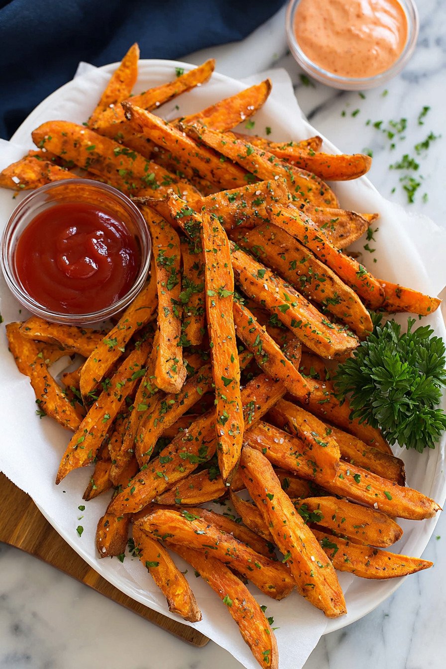 I cook this sweet potato fries recipe at least once a week. That might sound like a lot of fries in one house, yet we never complain. A hot tray of crisp fries lands on the table and people appear out of nowhere. My kitchen has that effect. I start with a simple sweet potato fries recipe, slice the potatoes by hand, and watch the color change from bright orange to deep golden once they bake.