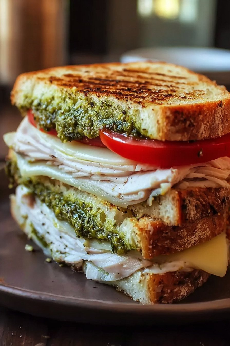 - Layers of turkey, creamy pesto, fresh vegetables, and toasted bread create a balanced mix of savory, herby, and crisp textures.
