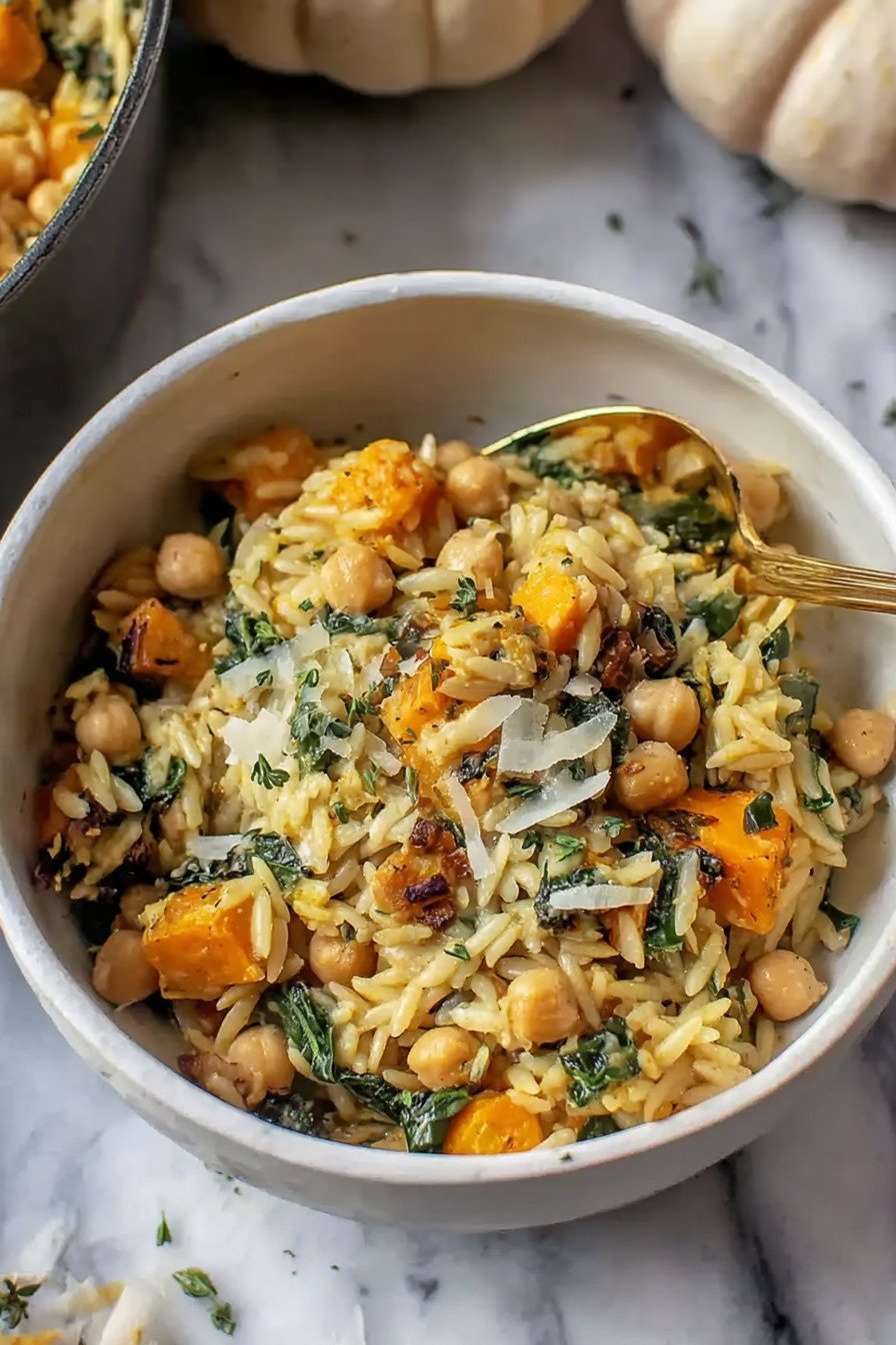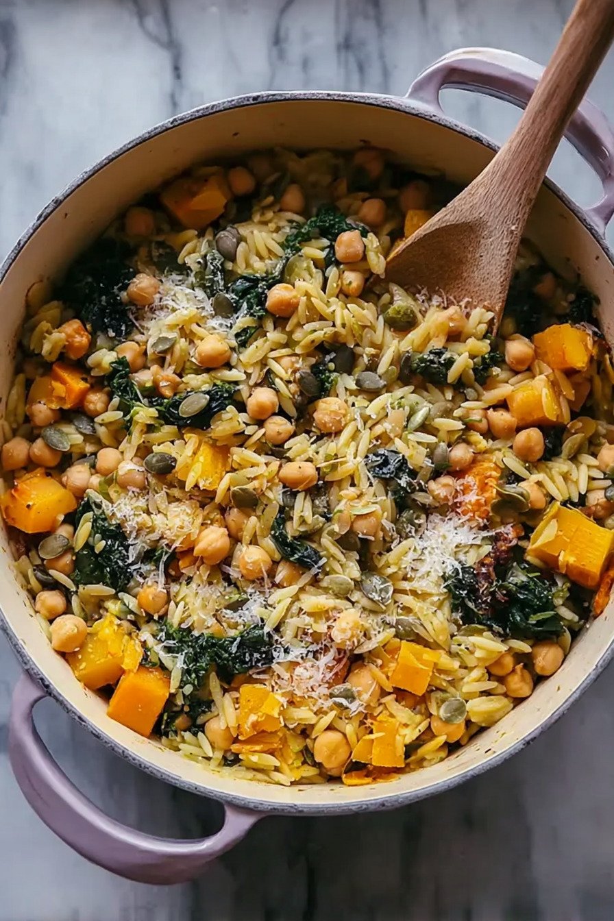 • Easy One Pot Fall Vegetable Orzo and Chickpeas Recipe
