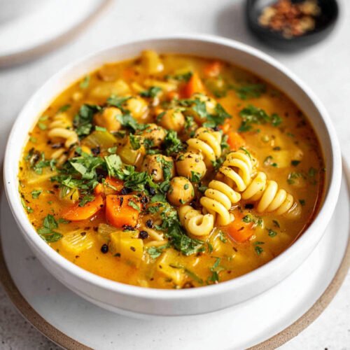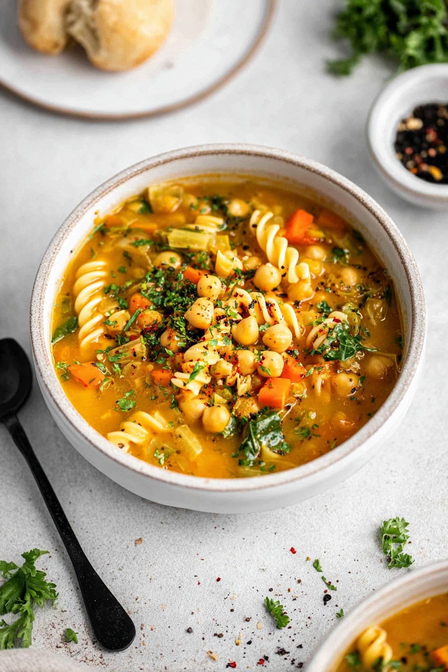 Friends arrive. We set bowls on the counter. The noodles plump and hold broth. Chickpea soup comfort meets noodle soup ease. A squeeze of lemon makes the room smell bright. This sits in the set of Vegetarian Soup Recipes we reach for again and again.