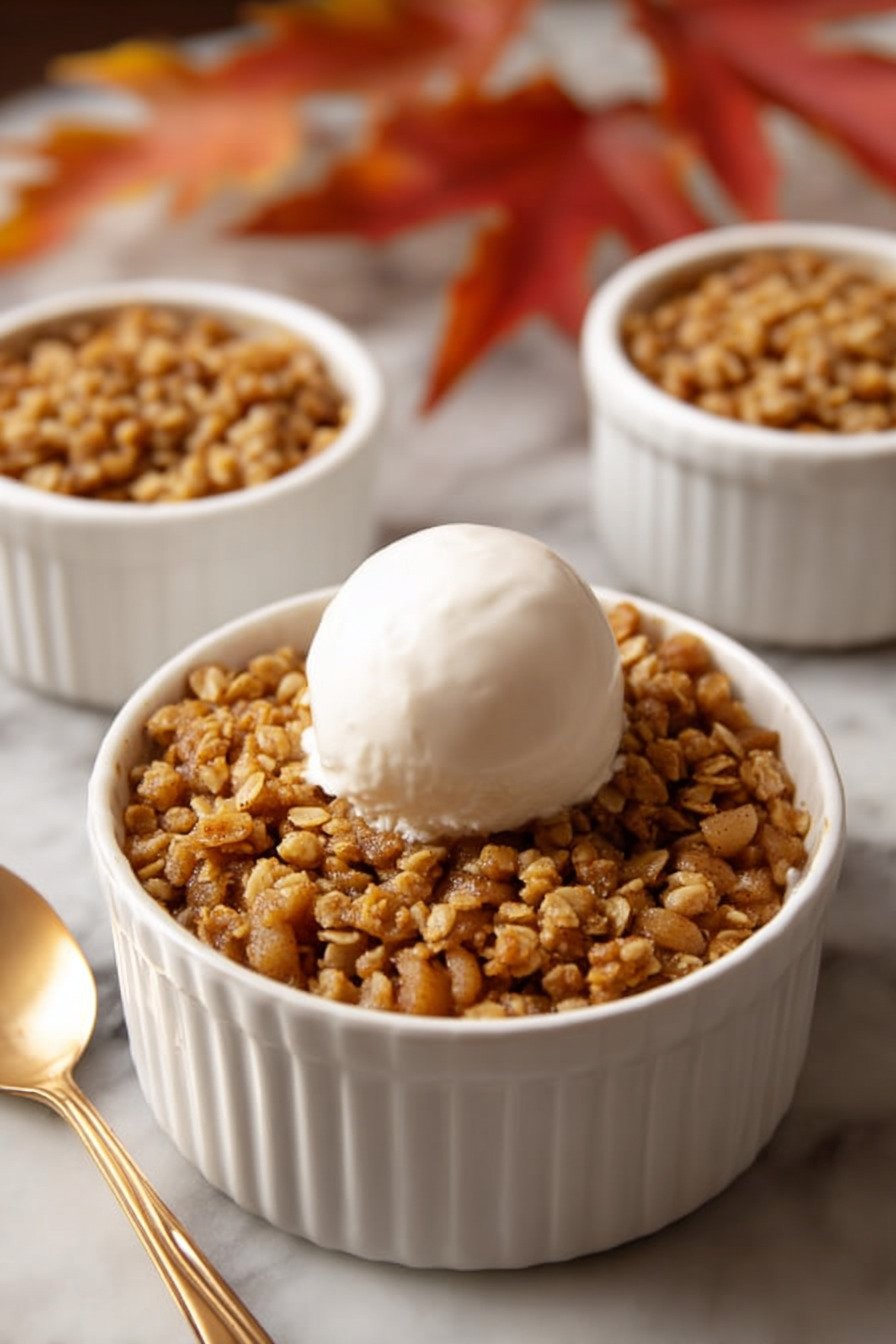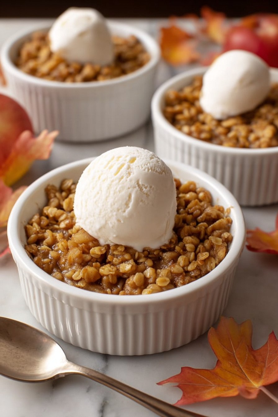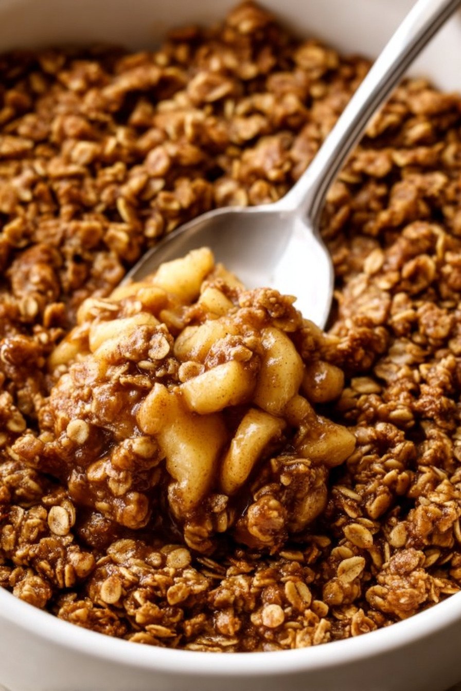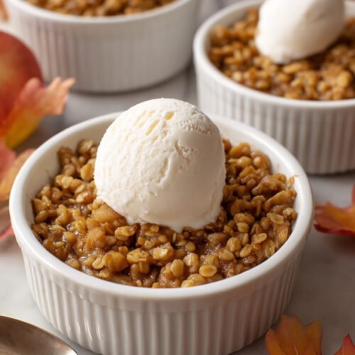 To reheat set a scoop in a small dish and warm in the oven or the air fryer. A short heat brings back the crunch on the crumb and the apples turn silky again.