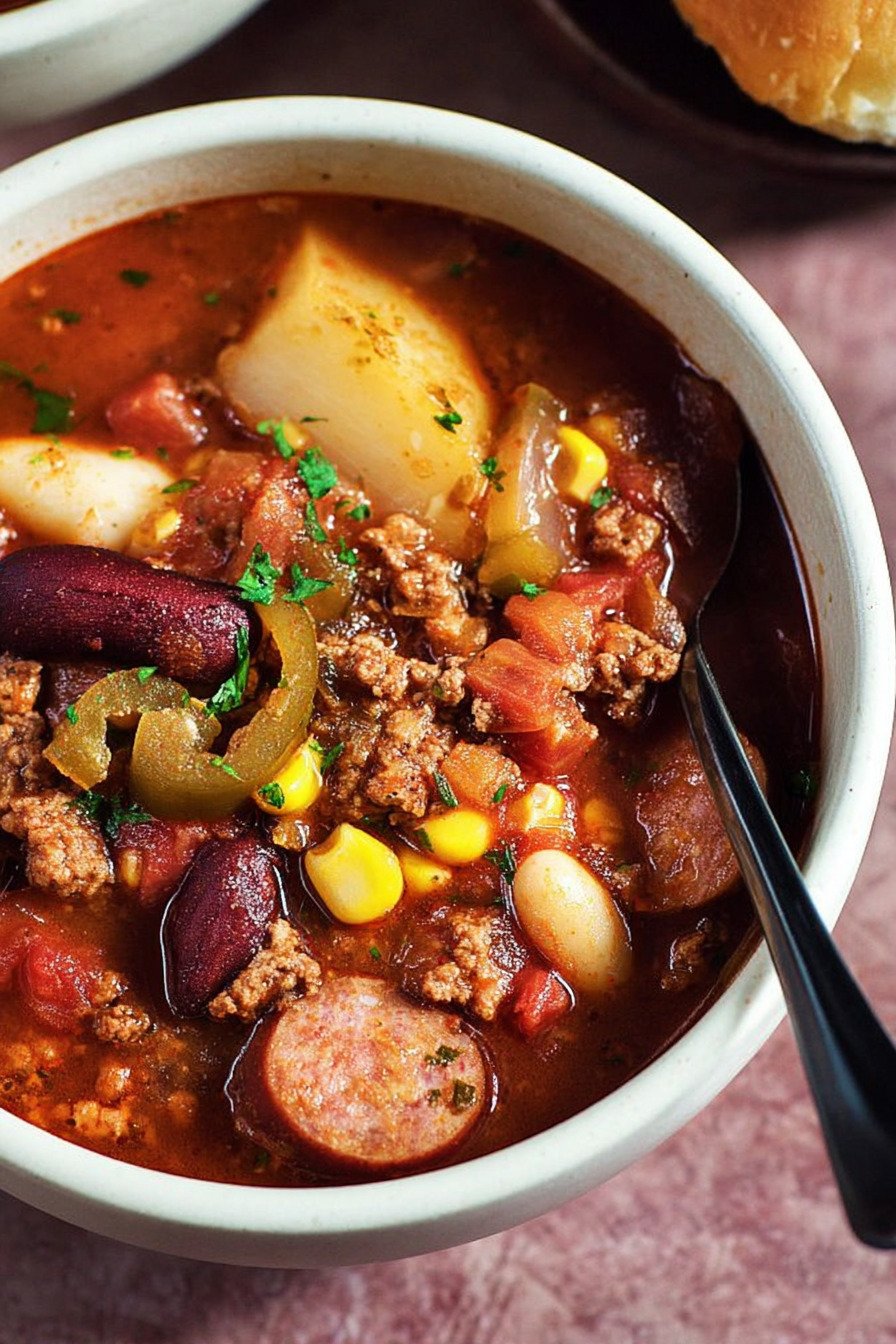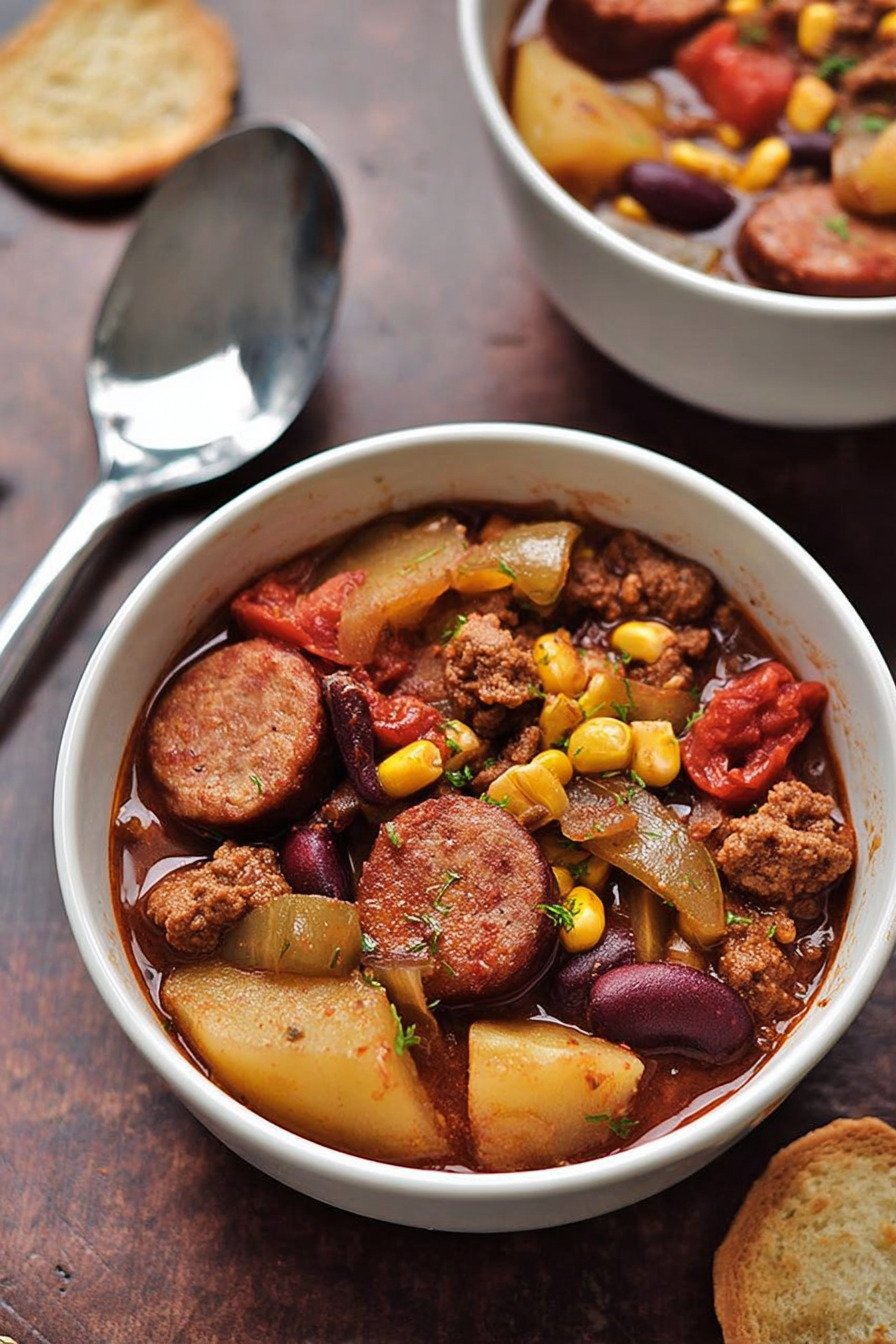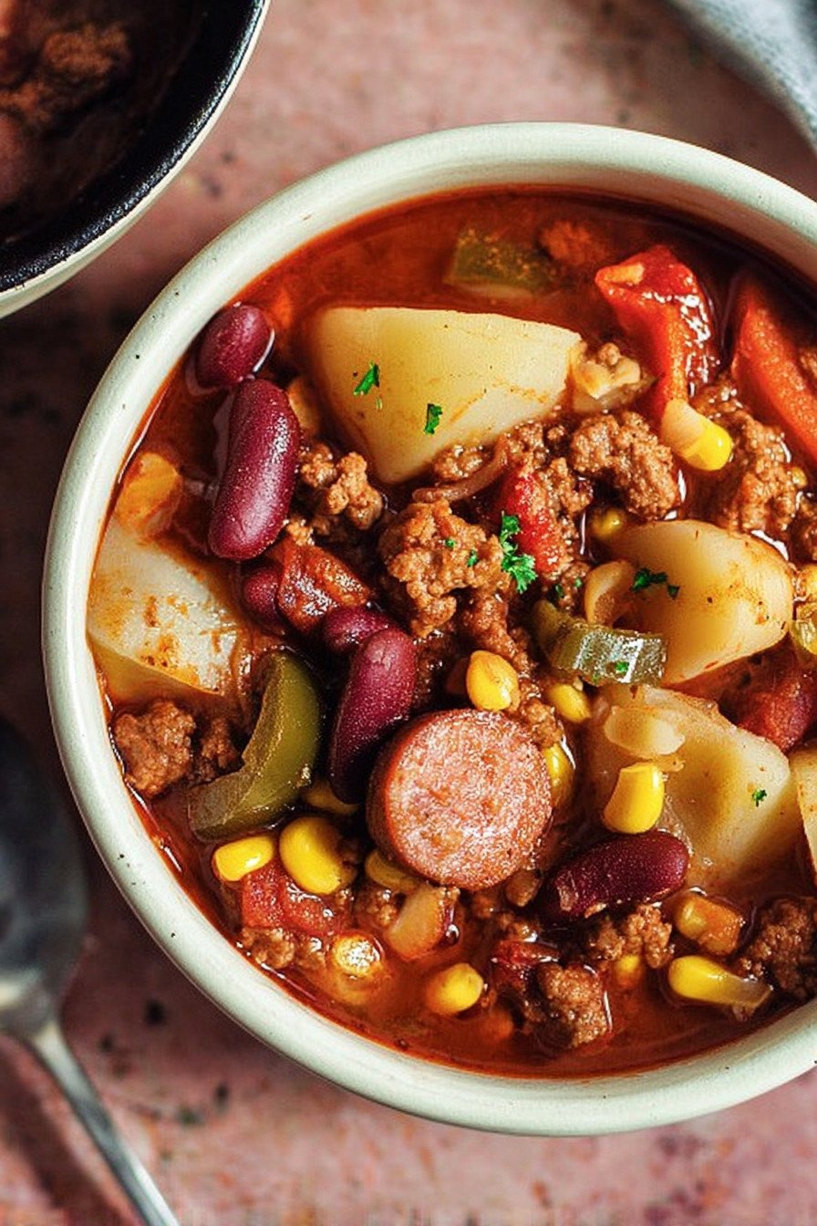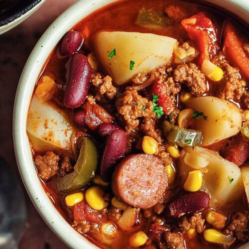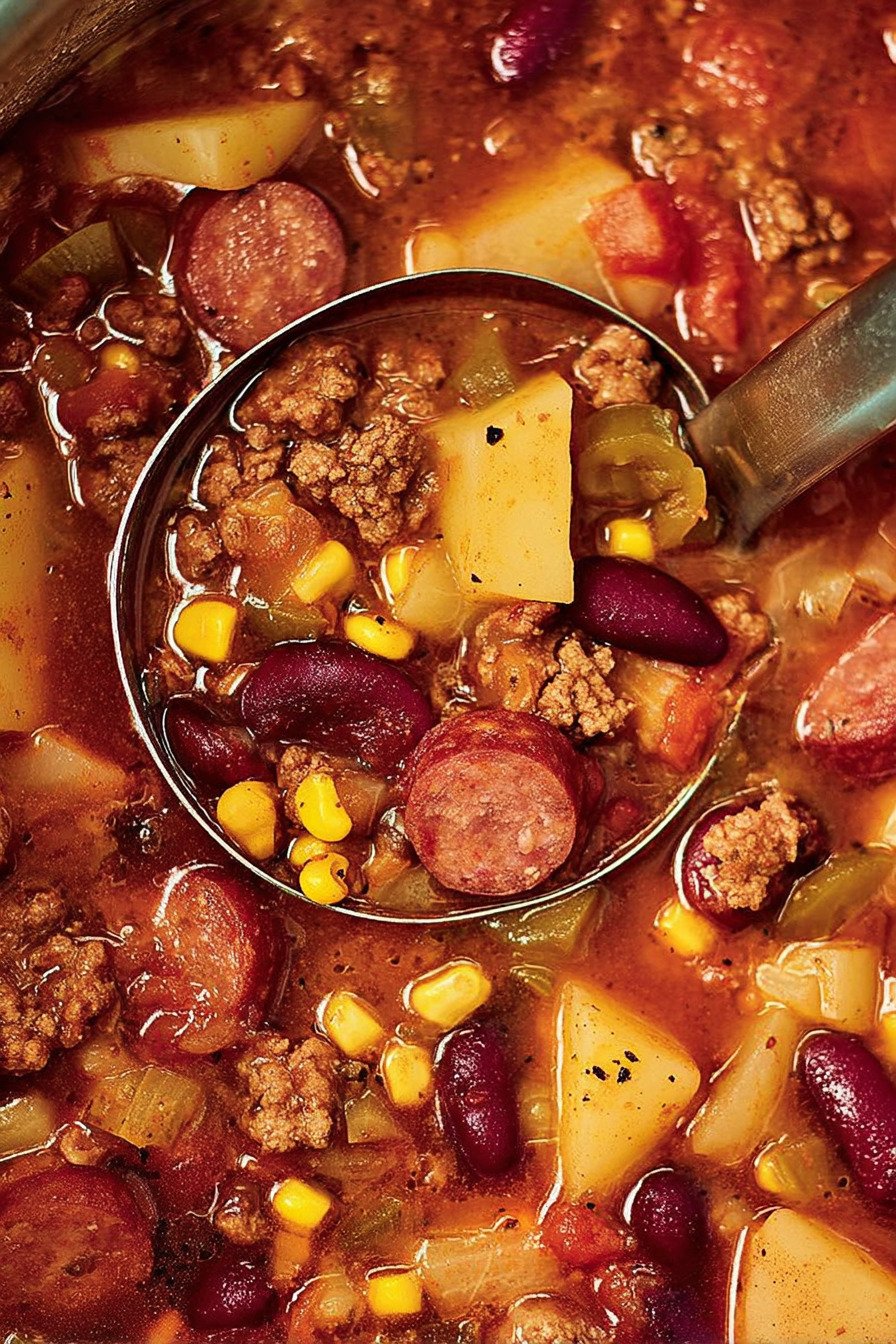 I grew up loving big pots of stew that sat on the stove and filled the house with a deep savory smell. This bowl takes that same cozy idea and turns it into a beef stew recipe that feels simple and filling. I lean on pantry basics, ground beef, beans, corn, and cabbage. Folks who search texas cowboy stew recipe often want that bold camp style flavor. At the same time the pot reminds me of meals like a korean beef stew recipe or even a filipino beef stew recipe where slow simmered beef makes the broth rich. If you enjoy a beef stew recipe stove top meal you can cook with little fuss, this one works great. I even treat it like an easy beef stew recipe stove top dinner on busy nights. And when cabbage softens in the pot it almost feels close to a cabbage stew recipe from a farmhouse kitchen. I still laugh when I think about the first time I made it for friends. I tossed everything in one pot and hoped for the best. The smell alone pulled people into the kitchen. Someone grabbed bread. Someone grabbed bowls. The stew tasted smoky, warm, and a bit messy in the best way. That is the charm of this meal. No strict rules. Stir the pot, taste the broth, add a pinch of salt if it needs it. In less than an hour you get a thick hearty stew that feels like it came from a long camp cookout.