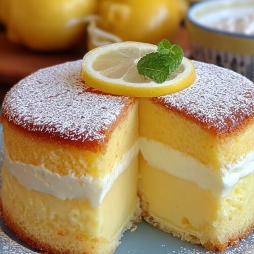 When I first made this Lemon Custard Cake, I didn’t expect it to be such a showstopper. The way it bakes into three dreamy layers — a light sponge on top, creamy custard in the middle, and a soft, lemony base — feels like magic. You’d think I spent hours in the kitchen, but it’s actually one of the simplest cakes I’ve ever made. The flavor is pure sunshine. Bright lemon zest and a hint of vanilla come together in a smooth, tangy sweetness that makes each bite feel like a spoonful of summer. I like to serve it chilled, with a dusting of powdered sugar and maybe a few fresh raspberries if I’m feeling fancy. If you love lemon desserts, this is the one to keep in your back pocket. It’s one of those custard cake recipes that somehow tastes both rich and light at the same time — a perfect balance. Whether you call it a lemon curd cake recipe or the best lemon cake recipe out there, it never disappoints. Sweet, easy, and impossible to forget.