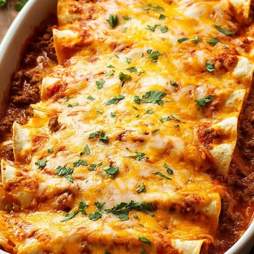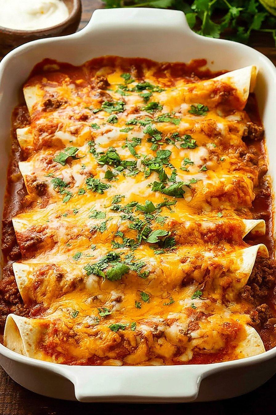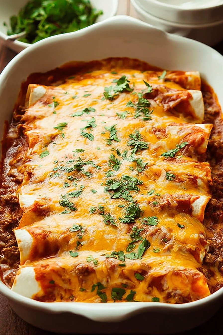 Cheese Shredded cheddar or a simple blend melts into a stretchy layer over the top. When the pan comes out of the oven the cheesy enchiladas draw everyone toward the table before you can even call them.