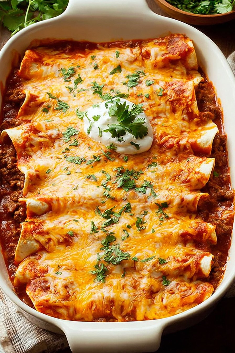 Spices A mix of chili powder cumin smoked paprika and a touch of oregano keeps the filling warm and deep without feeling heavy. The blend makes these beef enchiladas feel close to the kind of Mexican home cooking recipes many families pass around.
