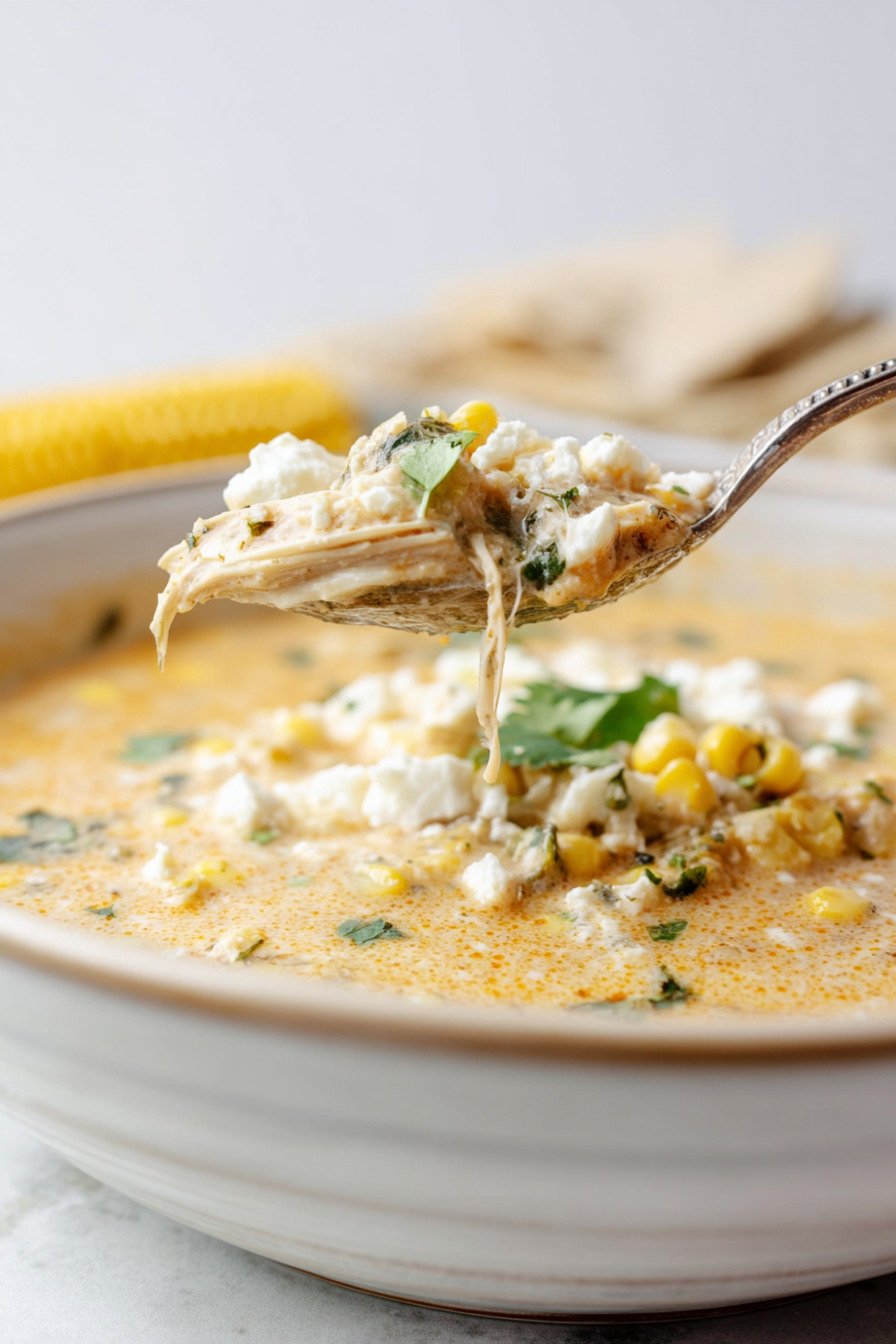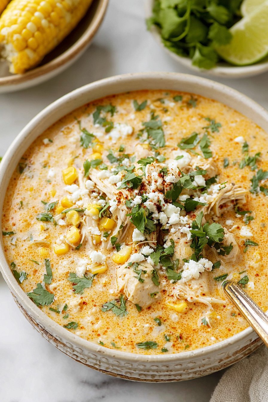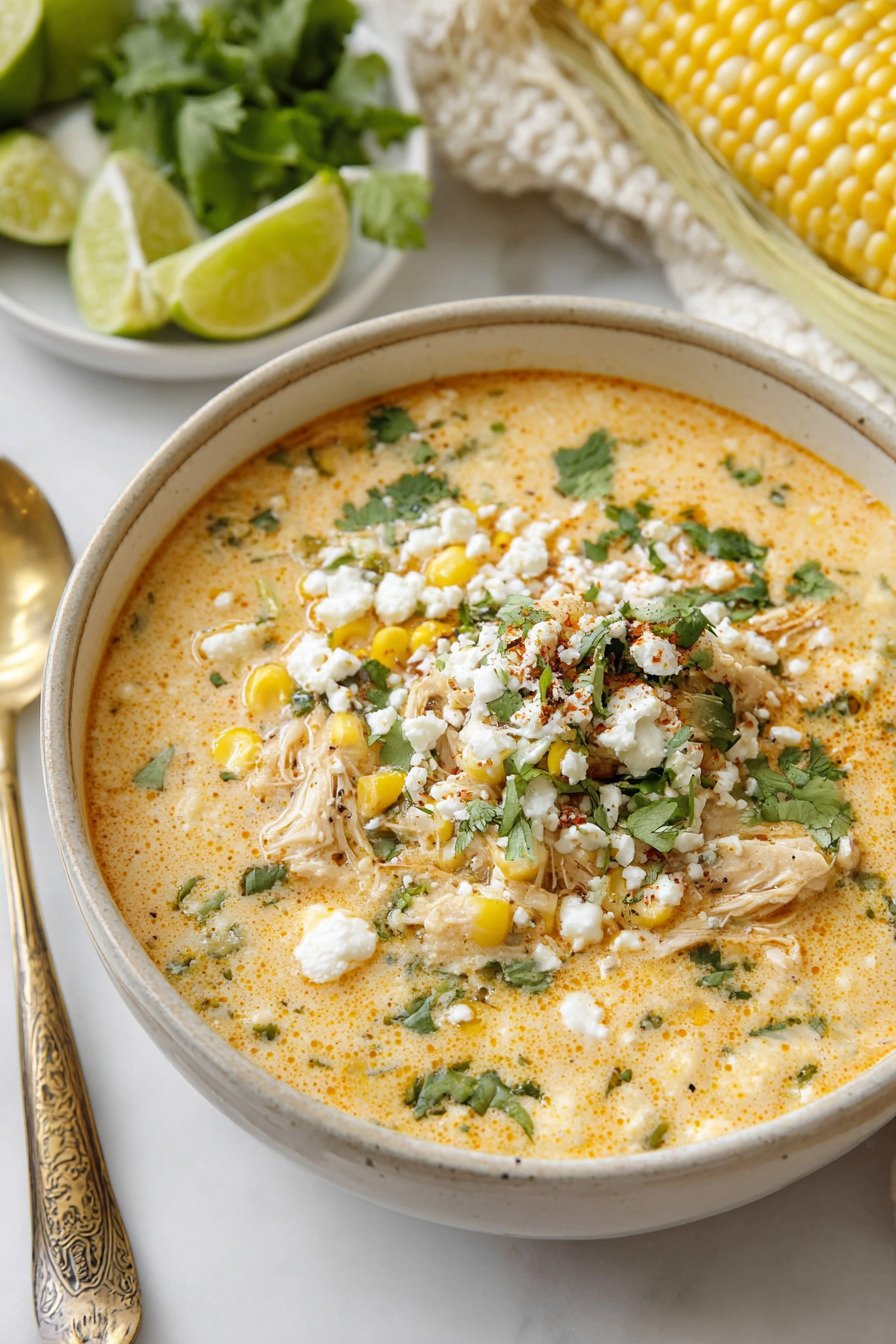 Our bowl borrows the joy of elote and sets it in a spoon friendly format. I lean on pantry broth and a splash of cream for body. I keep heat gentle so the sweet notes lead. I finish with cotija and cilantro for a bright edge. The result reads as creamy corn soup with spirit and charm.