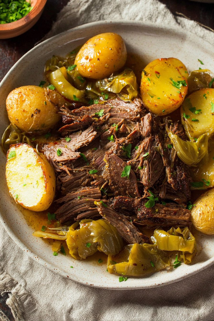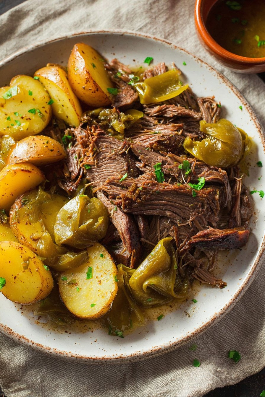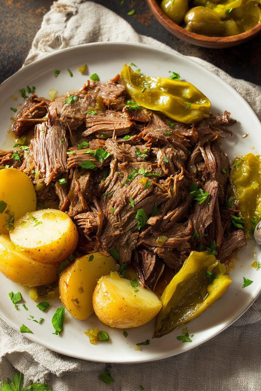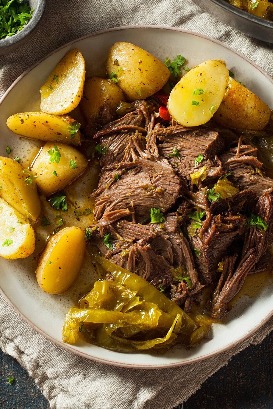 The smell fills the kitchen and wraps around you. Butter melts into the beef. Pepperoncini add a soft tang. We slice it or shred it, spoon it over potatoes, and no one talks for a minute. That silence says it all.