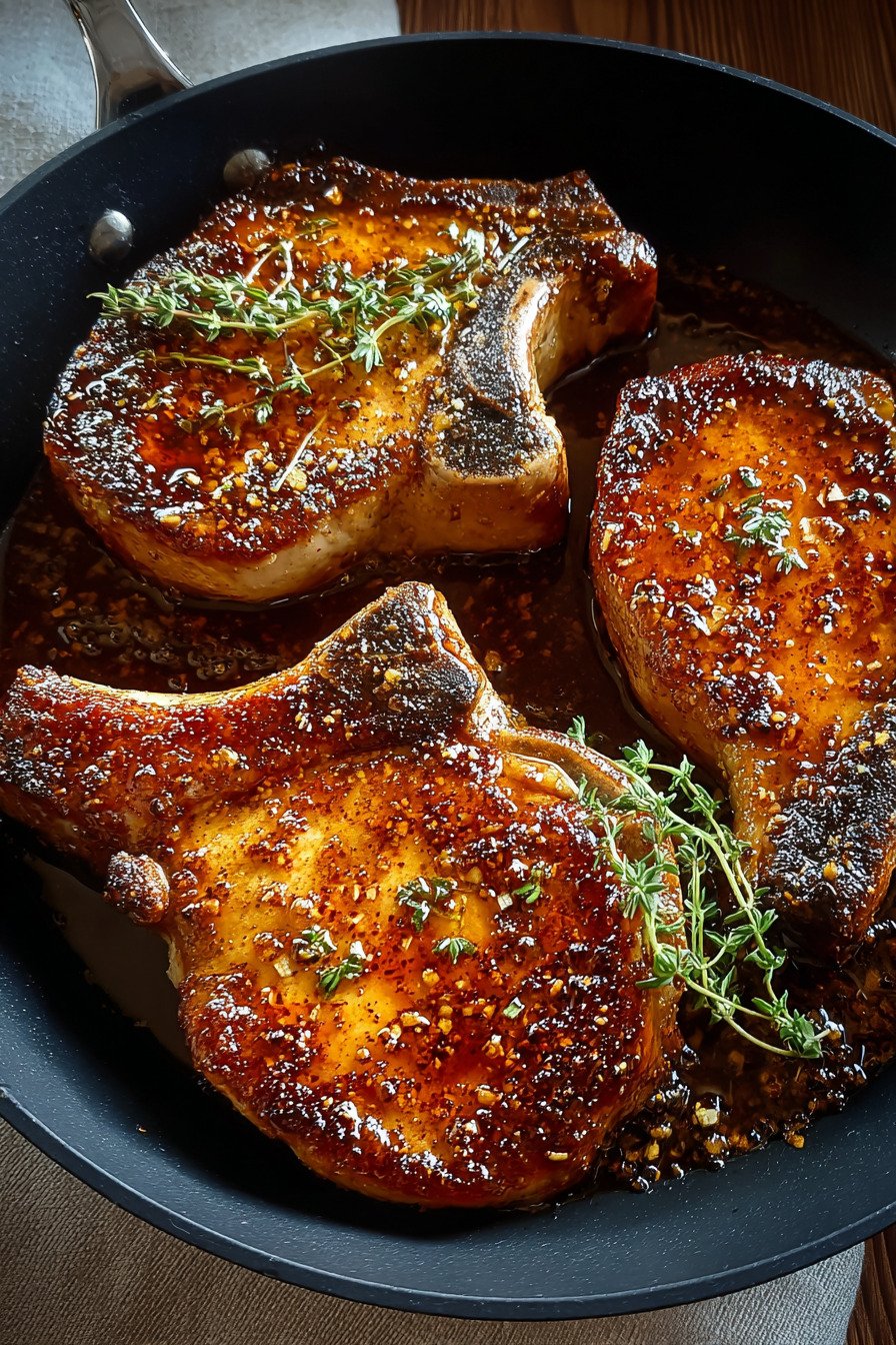 8. Rest the pork chops in the pan for five minutes, spooning the glossy sauce over the top before serving.