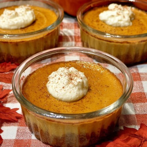 I grew up with a spoon in one hand and a pumpkin pie recipe in the other. When the air turns crisp, I reach for real pumpkin and make these soft custard cups that taste like pie without the crust. This simple pumpkin pie recipe leans light. I use plant milk and a gentle bake, so each bite feels cozy, warm, and honest. We whisk and pour and wait, and the kitchen smells like cinnamon and the best kind of fall. I use fresh pumpkin when I have time, and canned when I do not. Call it a healthy pumpkin pie recipe that still gives you that silky custard you want. It is a real pumpkin pie recipe and it works for weeknights, for Friendsgiving, and for that quiet craving right after dinner. You can make this as a pumpkin pie recipe with real pumpkin or with a can. It stays friendly and calm. Baked in little cups, it sets fast and chills well. If you need a simple pumpkin pie recipe for guests, this one helps. And if your pantry looks thin, try a pumpkin pie recipe without evaporated and use almond milk instead. Either way, the flavor lands right where you want it.