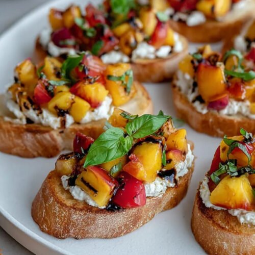 I like recipes that surprise guests without stressing me out. This peach bruschetta checks that box. You grab a baguette, toast the slices, and spread a soft ricotta mix. Place ripe peach slices on top, sprinkle basil, and you’re done. It feels almost unfair how little effort this takes for such a reward.