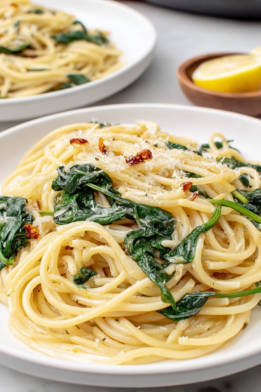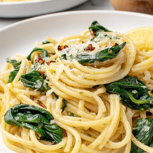 Bright noodles, soft spinach, and a squeeze of lemon make weeknight calm. This fits spinach dinner recipes and tastes clean and light. It plays well with Alfredo Pasta Recipes and Baked Pasta Recipes and sits right with simple American Dinner Recipes. Need ideas fast? Think Spinach Dinner Ideas that still feel cozy. Fans of Lemon Pasta Recipes and Healthy Dinner Recipes will be happy here. We cook, we twirl, we eat, and life slows down for a minute.