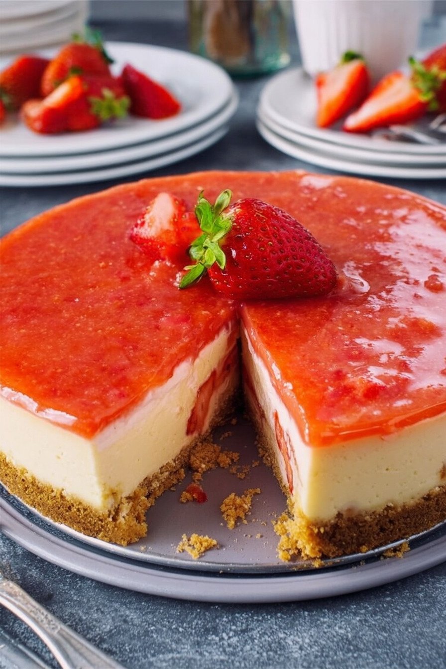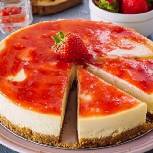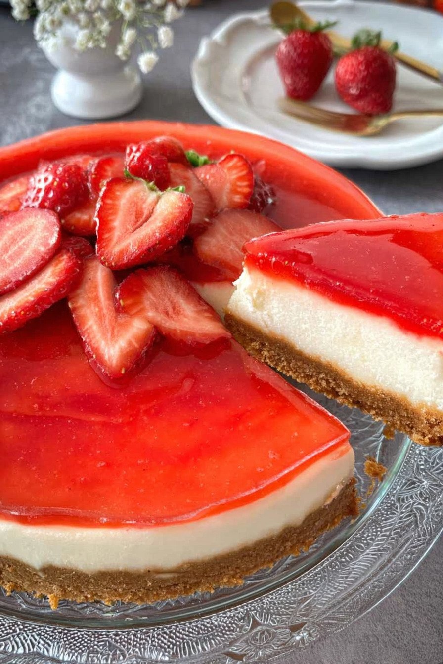 This cheese cake recipe gives you a creamy center, a firm cookie base, and fresh strawberries on top. I use simple steps and basic tools. We mix, bake, cool, and chill. That is it.