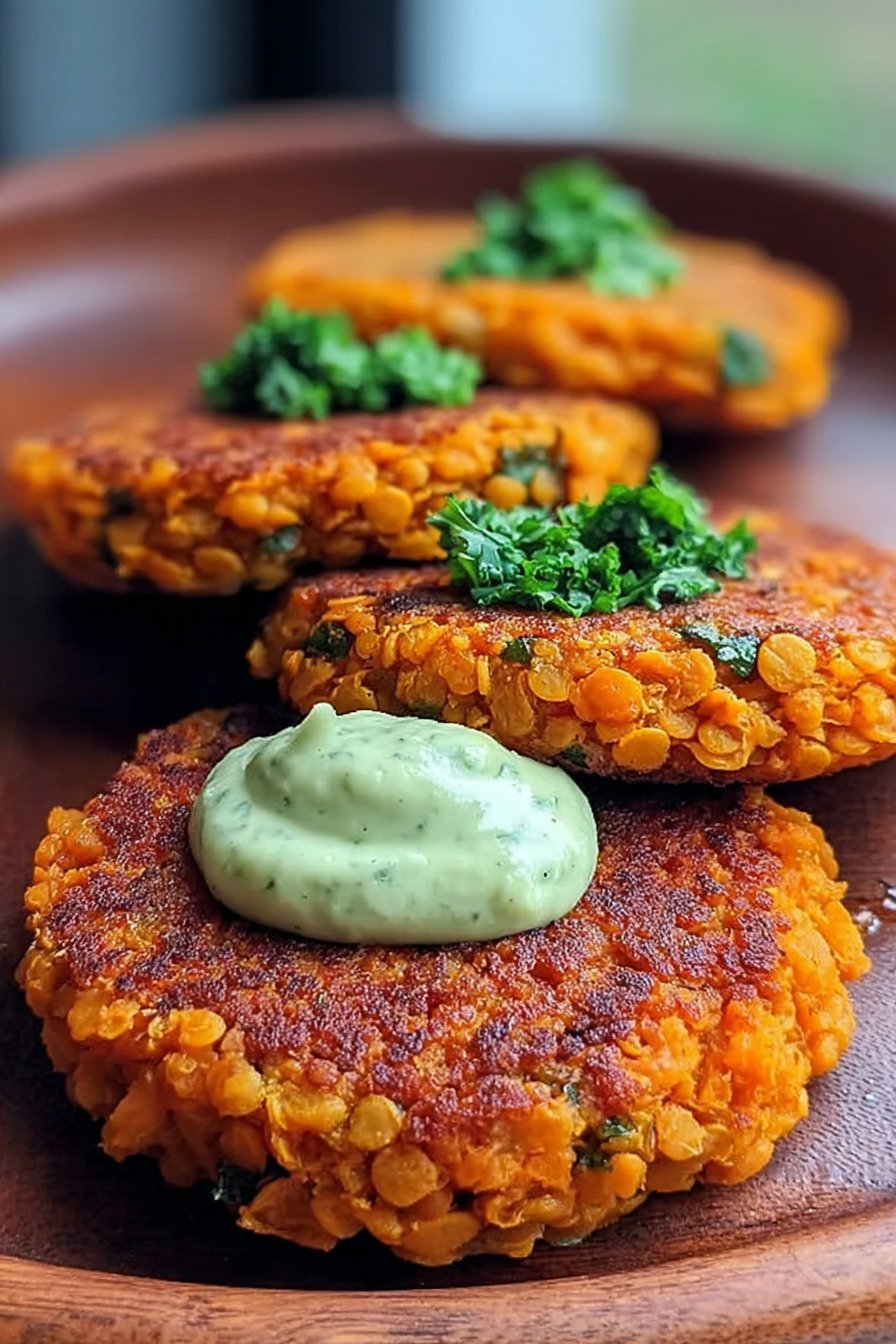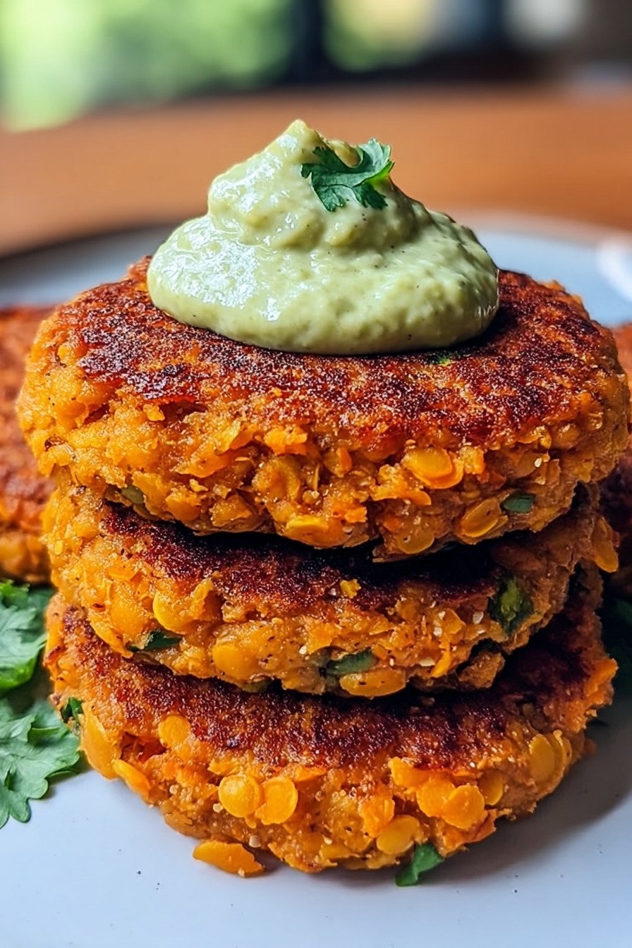 I make these patties when I want comfort that still feels light. Sweet potato meets red lentil and the mix turns crisp outside and soft inside. We eat them hot off the pan with a cool avocado sauce. The kitchen smells warm and nutty and I hover with a fork like a hawk. This batch fits many needs and moods. It checks sweet potato recipes and red lentil recipes. It lands as sweet potato patties and can pass for crispy lentil fritters. We treat them as vegetarian lentil dishes and as sweet potato snacks. Friends ask for healthy lentil recipes and I point here with a grin. I mash, you stir, we shape. Heat snaps, steam rises, and the first bite hits with a soft center and a crisp edge. The sauce stays bright and mellow and keeps the whole plate in balance. It is home cooking that plays nice on busy days and slow nights.