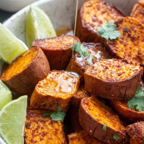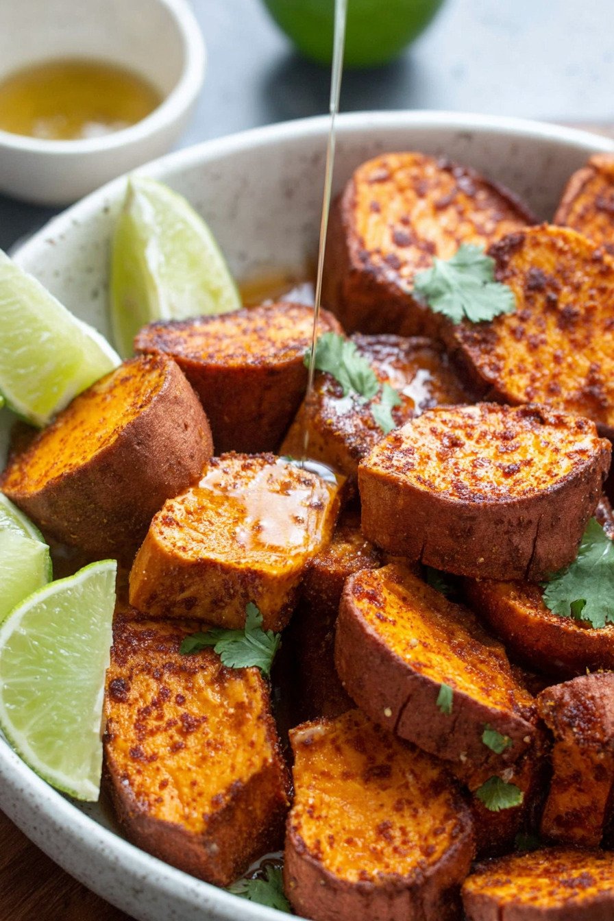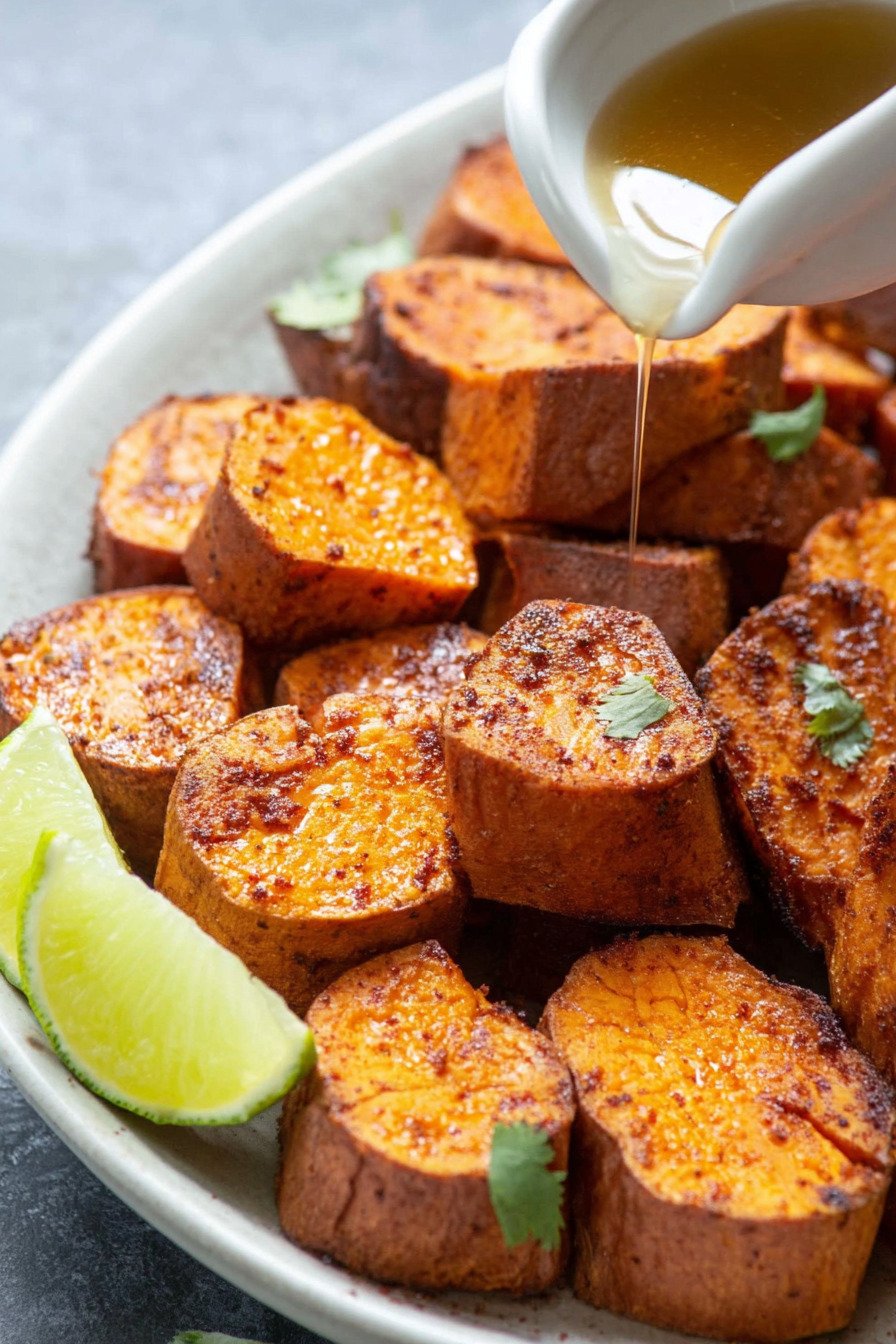 Finish with lime at the end not at the start. The juice can slow browning if it goes on early. The late squeeze keeps oven roasted sweet potatoes bright and lively. I often add an extra pinch of salt at the end to sharpen the flavors.