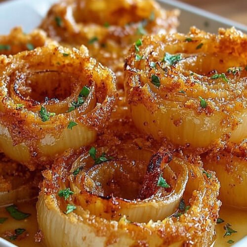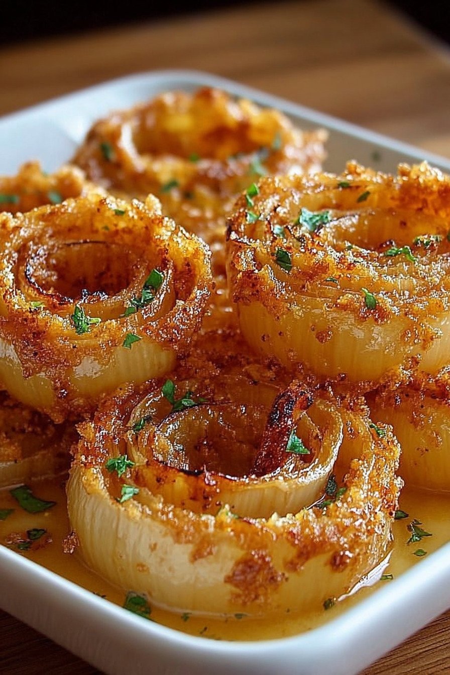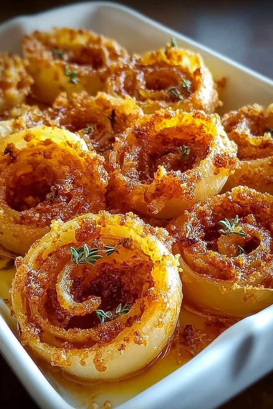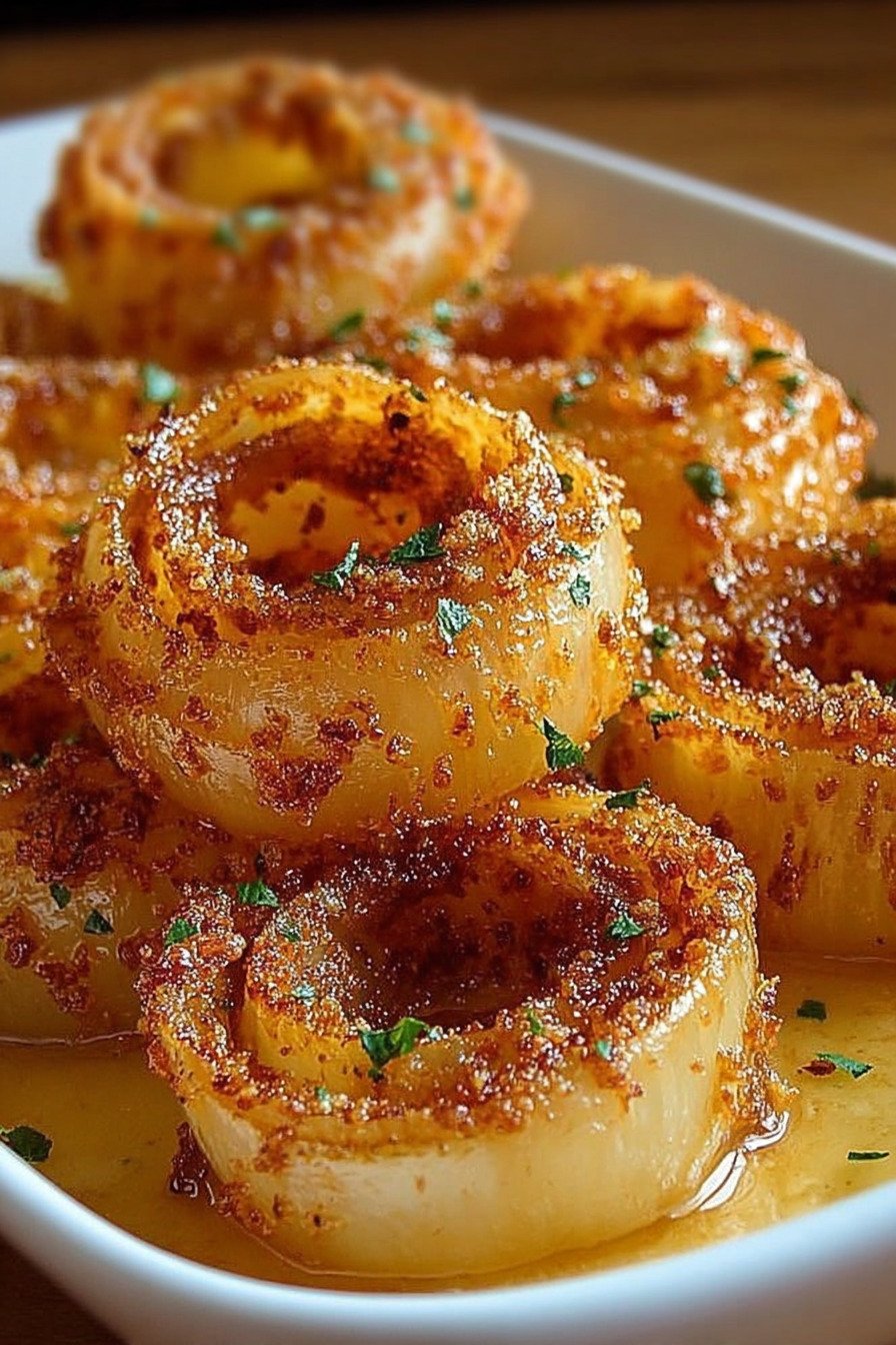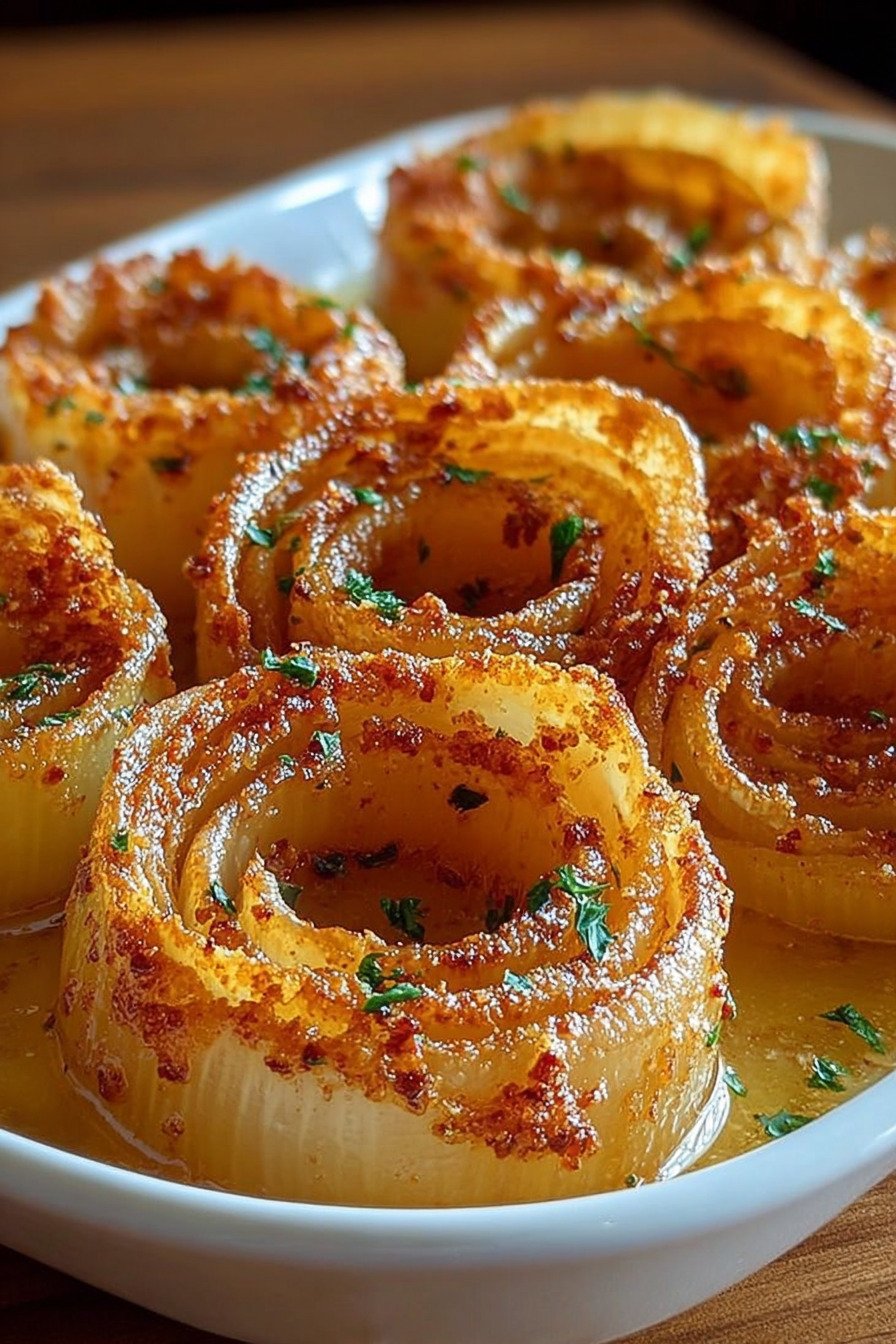 Sweet onions rest under butter and a trio of cheeses. Heat turns sharp edges soft. Every bite carries salt and a tiny spark of spice. The flavor reminds me of Baked French Onion Soup yet it plates faster. No pot of broth. No long simmer. Just rings layered and baked until golden.